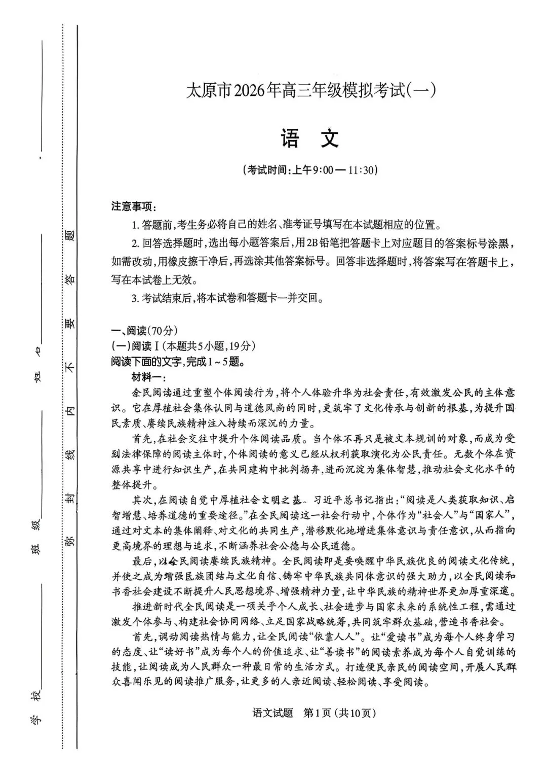太原一模太原市2026年高三年级模拟考试(一)