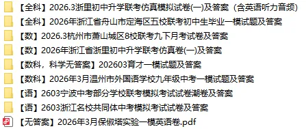 杭州各区一模、二模试卷(答案在公众号中找) (以下文章由中小学教育教学资源整理,未经允许不得转载) 2025年一模卷: 0.2025.3浙江省中考模拟潮汐组合潮卷-全科试卷及答案 1.2025年3月浙派联盟九下各科试卷+答案(含英语听力音频) 2.2025年浙江省初中学校“TZ-8”共同体九年级一模试卷+答案 3.2025年3月初中名校发展共同体试卷+答案(含英语听力音频) 4.【金华市一模】2025年4月中考一模各科试卷及答案(含英语听力音频) 5.【温州市一模】2025年4月中考一模各科试卷及答案(含英语听力音频) 6.【湖州市一模】2025年4月中考一模各科试卷及答案(含英语听力音频) 7.【浙江J12共同体联盟】2025年4月中考一模各科试卷及答案(含英语听力音频) 8.【杭州富阳区一模】2025年4月中考一模各科试卷及答案(含英语听力音频) 9.【舟山市一模】2025年4月中考一模各科试卷及答案 10.【台州市一模】2025年4月中考一模各科试卷及答案(含英语听力音频) 11.【杭州市余杭、临平区一模】2025年4月中考一模各科试卷及答案(含英语听力音频) 12.【绍兴市一模】2025年4月中考一模各科试卷及答案(含英语听力音频) 13.【衢州柯城·江山·龙游一模】2025年初中毕业生学业水平调研测试各科试卷(含答案·听力原文无音频) 14.【嘉兴市一模】2025年4月中考一模各科试卷及答案(含英语听力音频) 15.【宁波市一模】2025年4月中考一模各科试卷及答案(含英语听力音频) 16.【丽水市庆元、龙泉一模】2025年4月中考一模各科试卷及答案(含英语听力音频) 17.【衢州市一模】2025年4月中考一模各科试卷及答案 18.【杭州市西湖区一模】2025年4月中考一模各科试卷及答案(含英语听力音频) 19.【杭州市拱墅区一模】2025年4月中考一模各科试卷及答案 20.【杭州市钱塘区一模】2025年4月中考一模各科试卷及答案 21.【杭州市滨江区一模】2025年4月中考一模各科试卷及答案 22.【杭州市上城区一模】2025年4月中考一模各科试卷及答案(含英语听力音频) 23.【杭州市萧山区一模】2025年5月中考一模各科试卷及答案(含英语听力音频) 24.【杭州市萧山高桥联盟】萧山高桥联盟一模全科试卷及答案(含英语听力音频) 25.【杭州市临安】临安一模全科试卷及答案(含英语听力音频) 26.【城东一模】全科试卷及答案 以下一模截图: