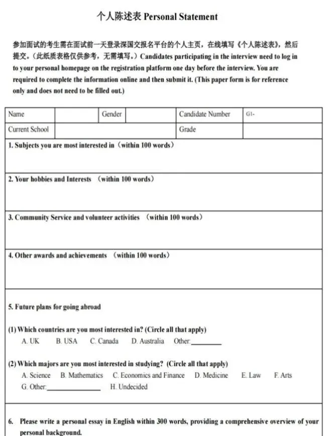 个人陈述可以提前准备!里面会写学生的成绩,过往参加的活动获得的奖项等,还有300-500字的essay[SEE EXAMPLE],面试一部分问题会围绕学生提供的这份ps问。深国交考试已形成较为稳固的范式,及早进行专业化准备才能圆梦深国交!