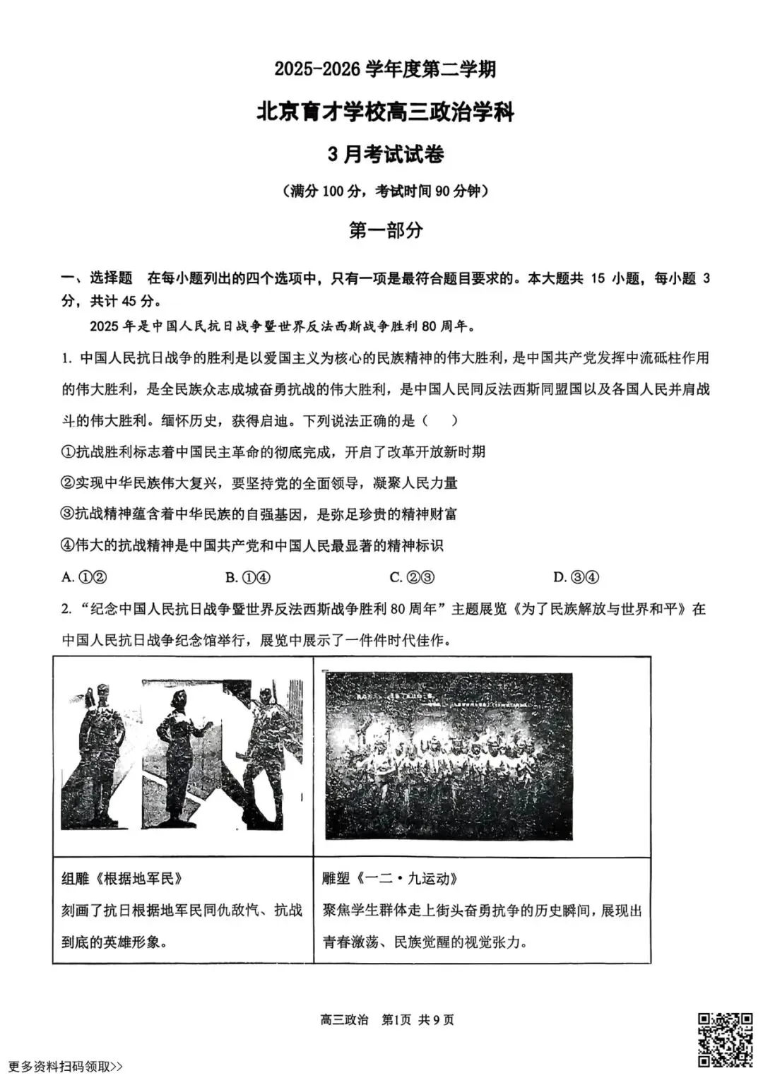今天给大家分享的是2026北京育才学校高三3月月考政治试卷(含答案),其他区域或学校的学生都可以练一练。近期会持续分享,欢迎大家多多关注,也可以把我们分享给更多人哦。