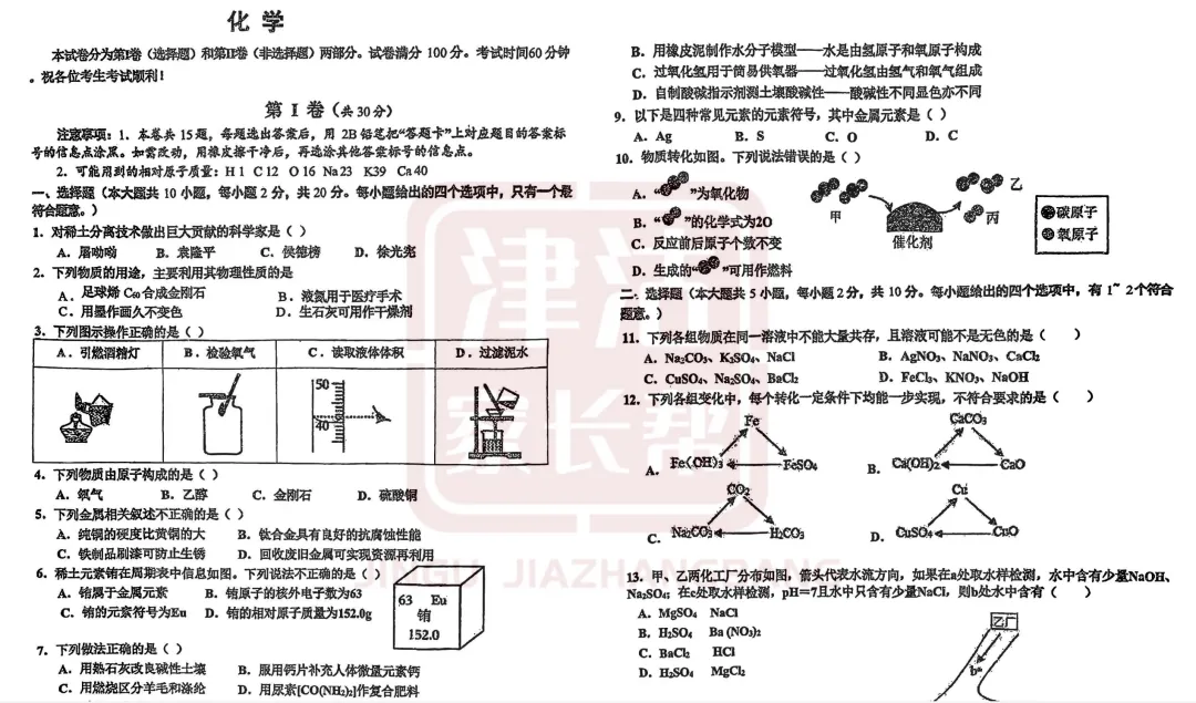 2026年天津红桥区初三结课考化学试卷,,满分100分。