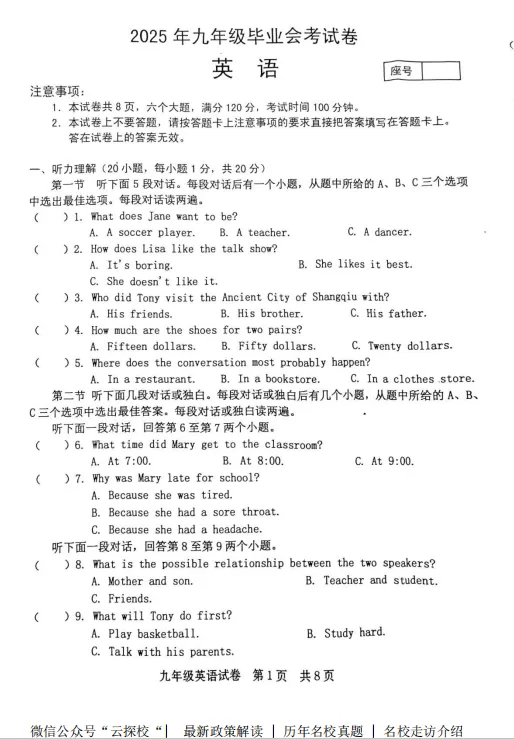 【中考一模】2025年商丘市中考一模试卷及答案(5科含听力)