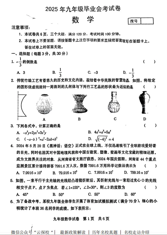 26年山西中考模考数学试卷及答案