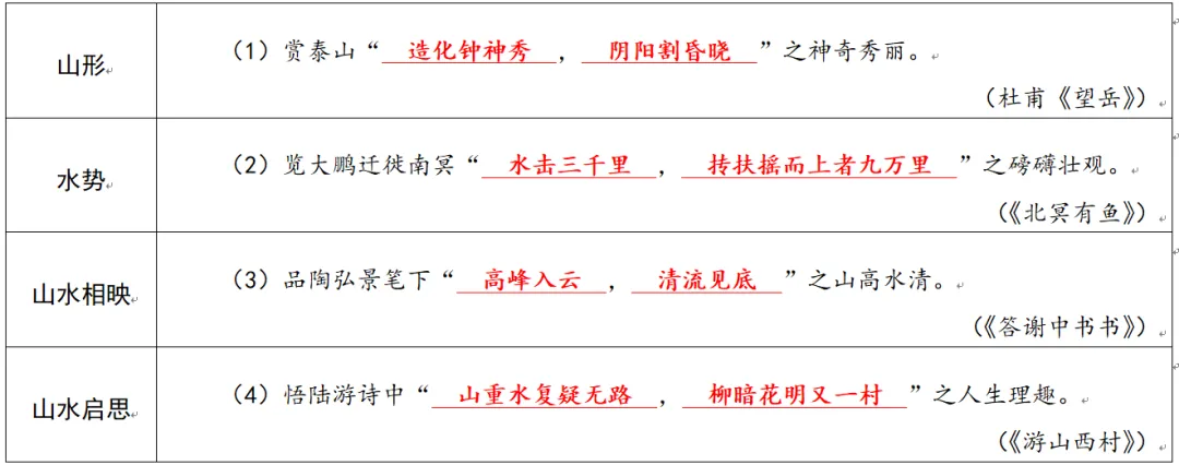 (1)杜甫《望岳》中“会当凌绝顶,一览众山小”两句,表现诗人登临的决心和豪迈的气概。