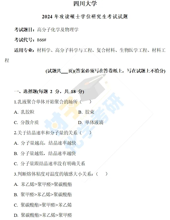 【考研真题】2024年四川大学(866高分子化学及物理学)考研真题公布