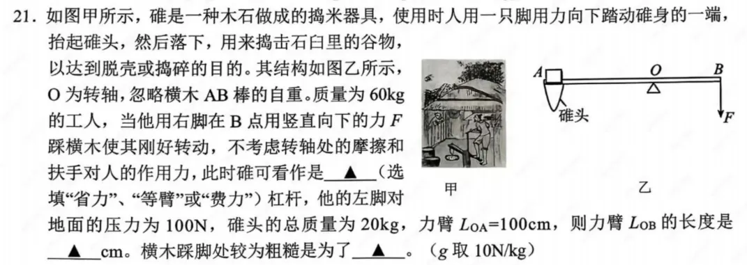分析:这张试卷上对于同学们的审题能力也有一定的要求。比如这道题,已知条件是人左脚对地面的压力为100N,但是对B点施力的是人的右脚。不知道这个小坑会有多少同学扑通扑通往里跳呢?