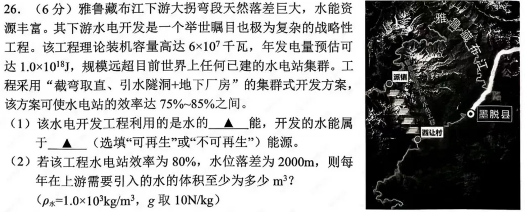 分析:这道题的第(1)问和第(2)问的之间是有联系的,如果想不到水力发电是将水的什么能转化为电能,可能也不知道第(2)问中“水位落差”这个条件怎么用;而解决这个问题的信息就在题干第一个逗号之前,“天然落差巨大”。所以,做题不读题的同学们,这个习惯要改改啦,避免遗漏关键信息。