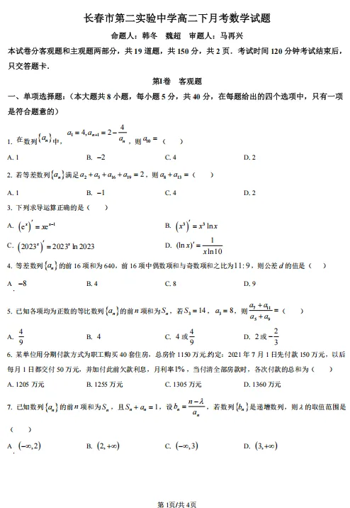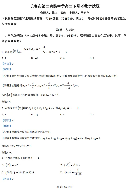 【高二】月考丨往期试卷-吉林省长春市第二实验中学2024-2025学年高二下学期4月月考