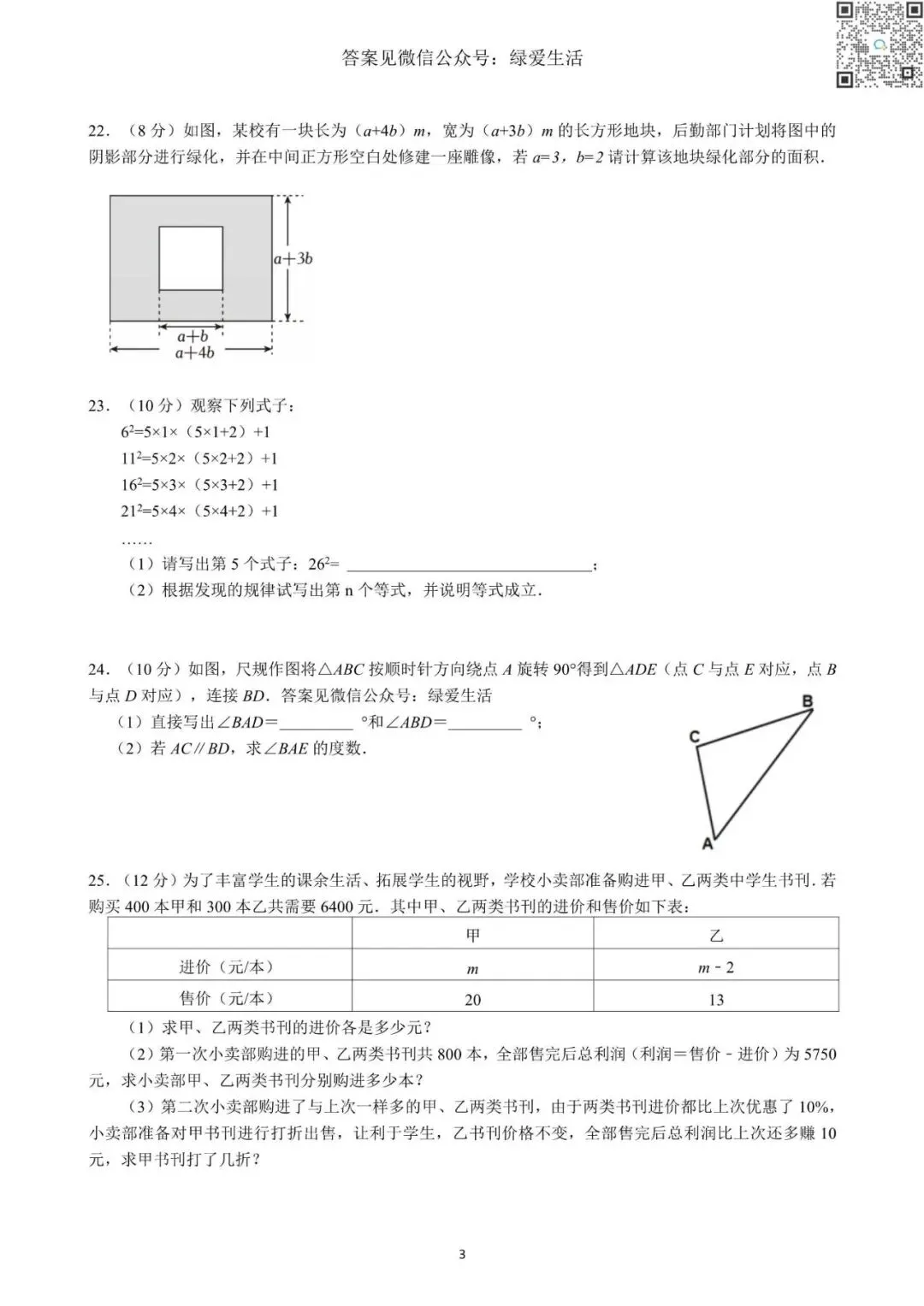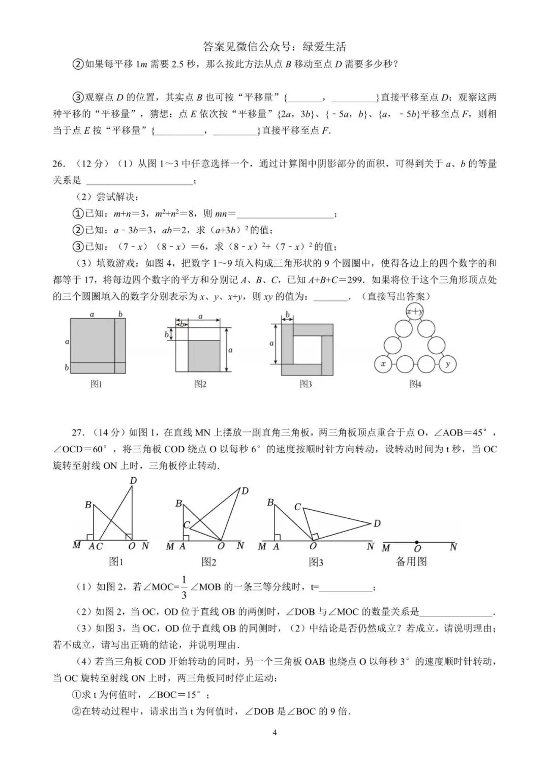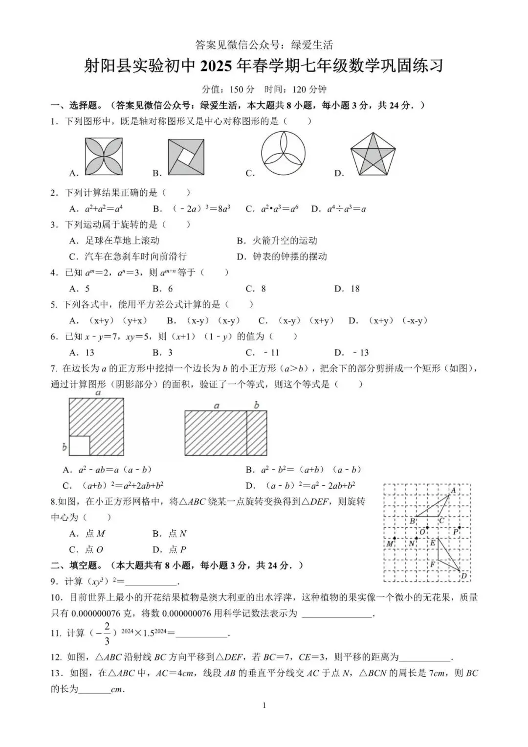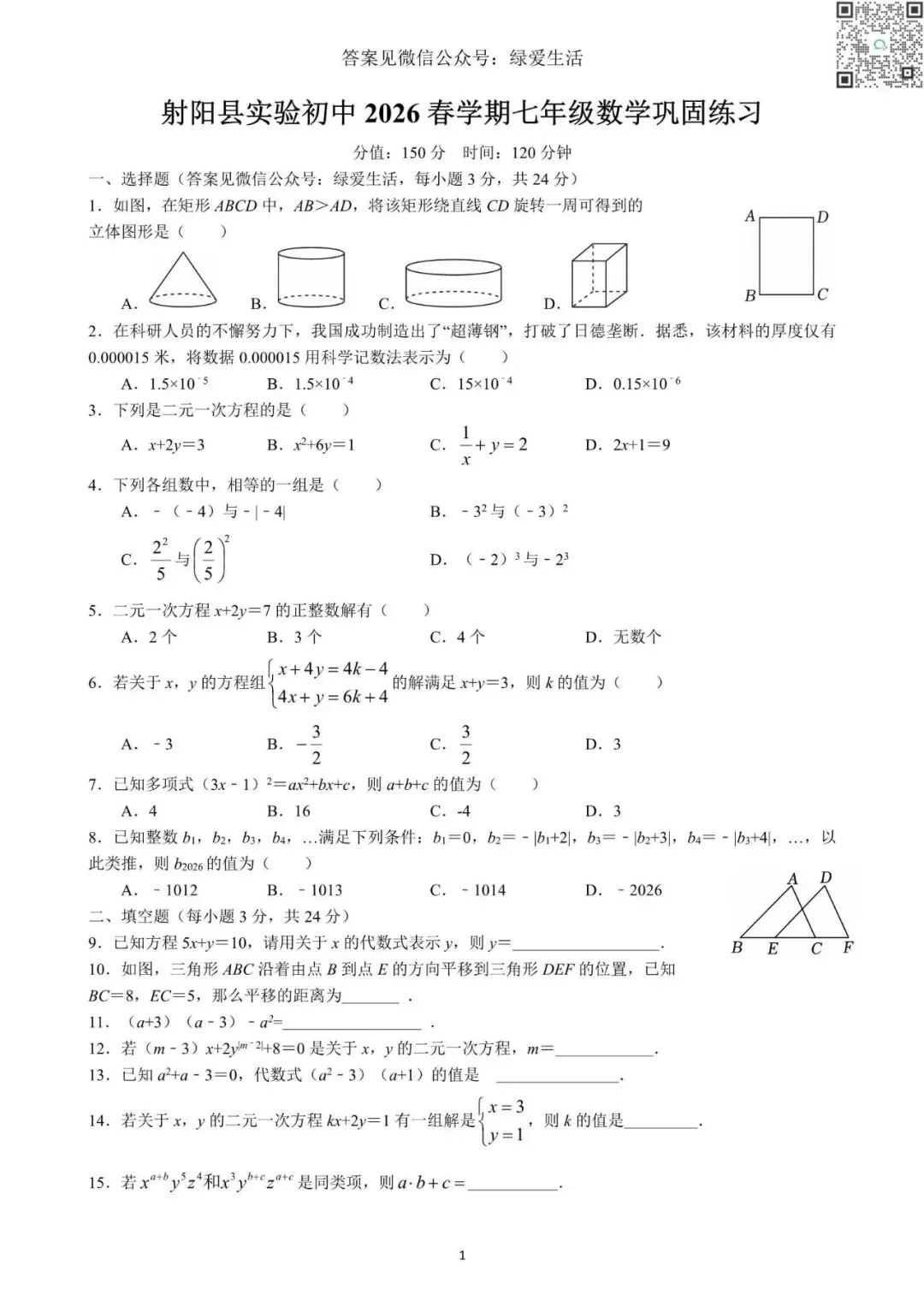 【射阳实验】初一数学试卷+答案(26年3月25日·附去年同期试卷)