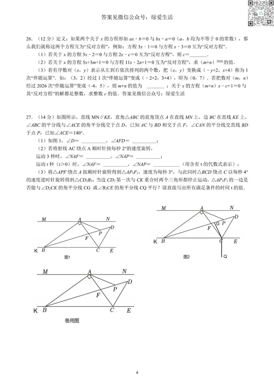 学校简介:射阳县实验初级中学是盐城射阳优质民办初中,建校来人均总分20次居盐城大市前列。2025年中考,首届摇号生70%达县统招线,52.5%考取省射中创新班,全县前十占7人,700分以上超500人,最高分765分。今天考的和去年同期考的试卷简介:这两份试卷立足基础、关注能力,呈现三大亮点:一、覆盖面广,梯度合理。紧扣七年级下册核心知识点(整式运算、方程组、图形变换),从基础计算到综合应用层层递进,既夯实双基又兼顾选拔功能。二、情境真实,素养导向。创设绿化面积计算、书刊采购等生活情境,融入"美好方程""智慧数"等新定义题型,考查即时学习与迁移能力,体现数学建模素养。三、动态探究,思维深刻。设置图形旋转、角平分线运动等动态几何题,渗透数形结合与分类讨论思想;压轴题综合方程、几何与规律探究,彰显逻辑推理与运算能力。整体而言,试卷结构规范(150分制)、图文并茂,既关注知识达成度,更重视数学思维品质培养。