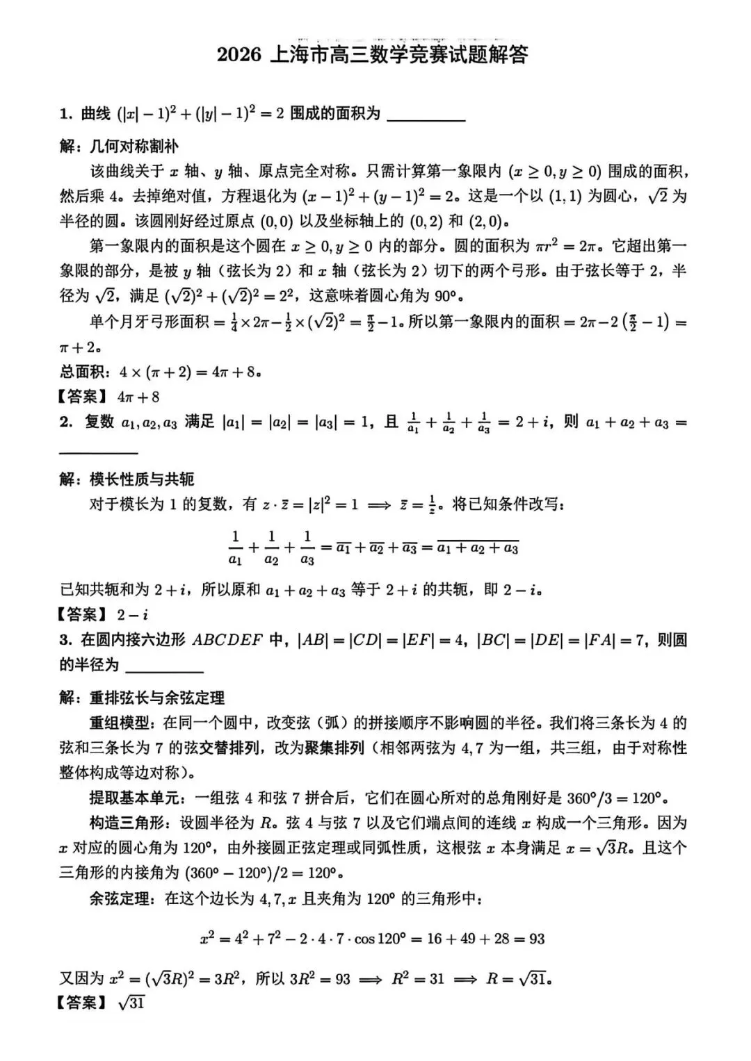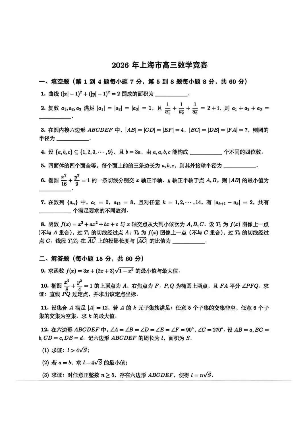>上海市2026年高三数学竞赛试卷及试卷及答案(2026.3)