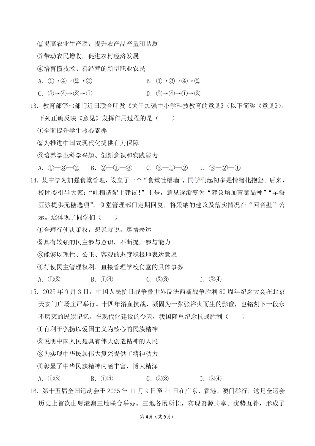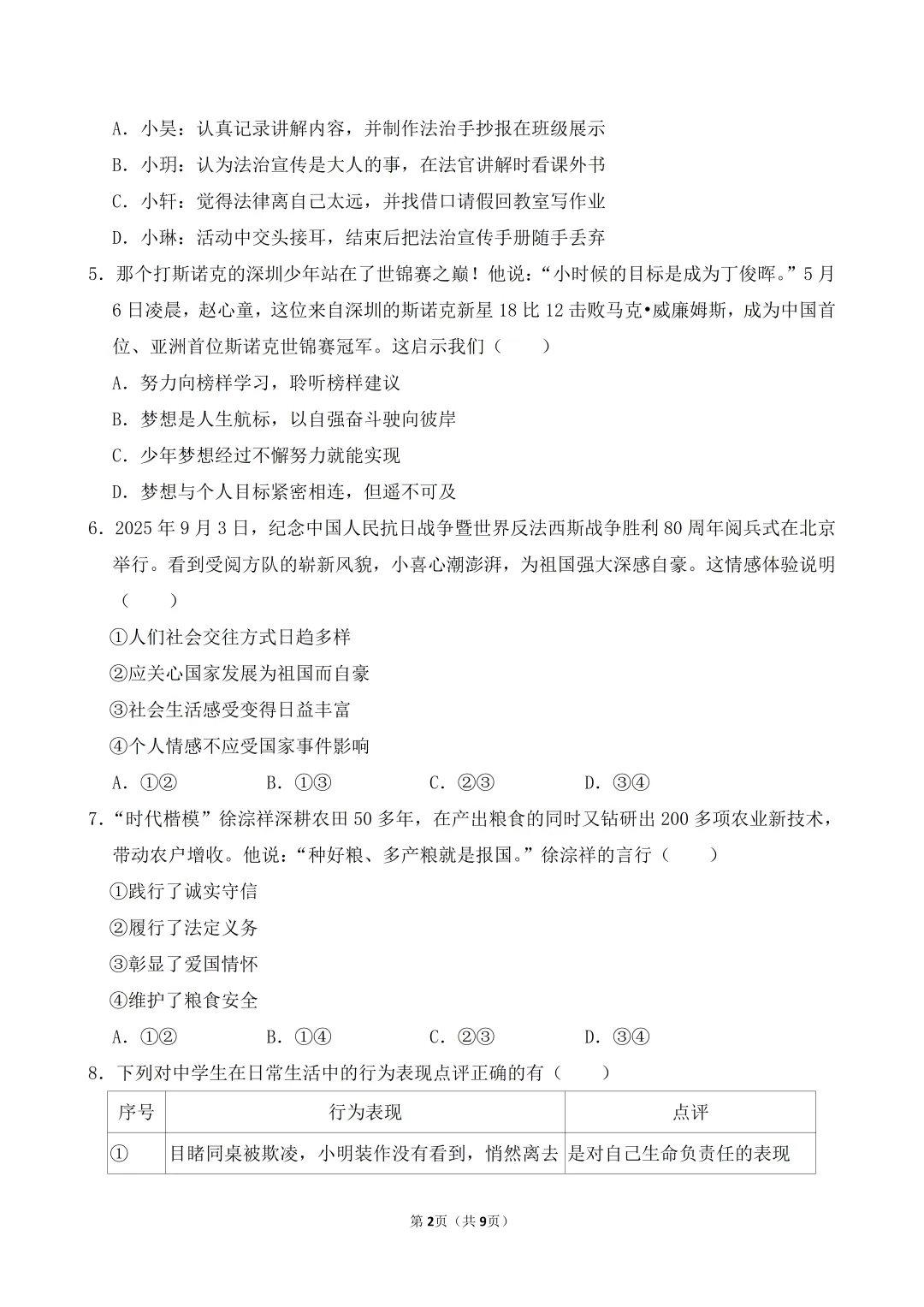 2026年中考道德与法治模拟试卷(四)