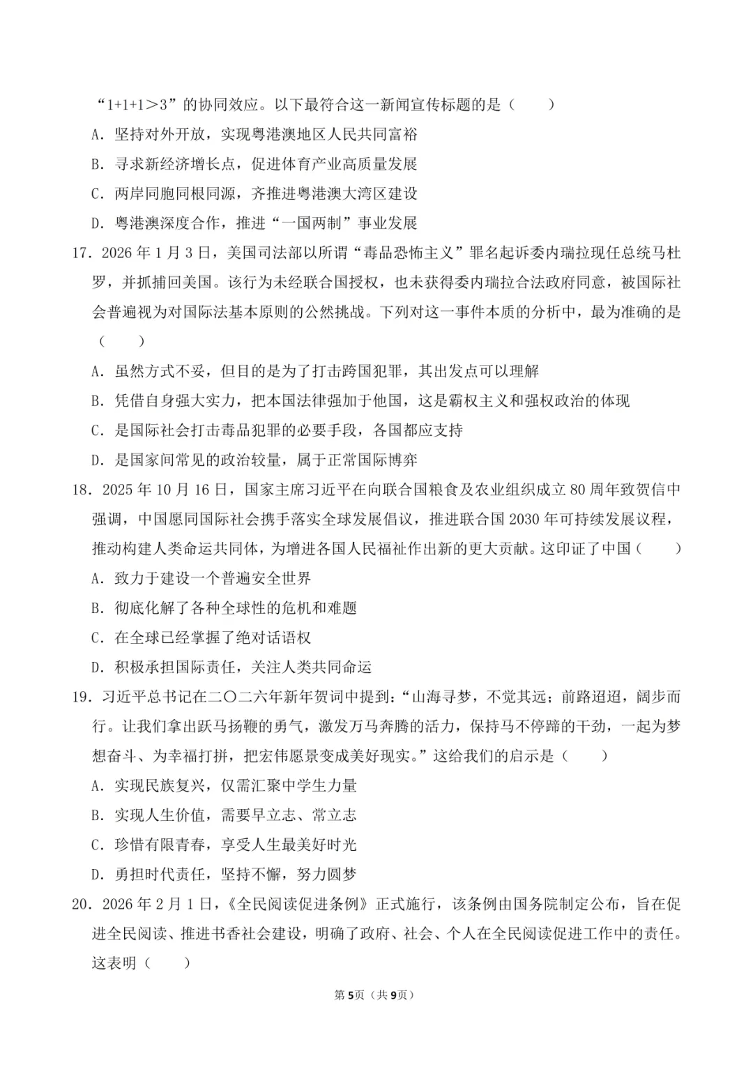 【试卷】2026年广州市高中毕业班综合测试(一)政治试卷