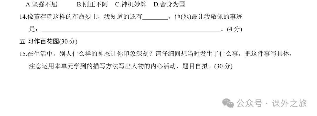 摔跤 他像一棵挺脱的树 两茎灯草 第14课 刷子李 习作例文: 我的朋友容容 小守门员和他的观众们 习作: 形形色色的人 第五单元知识点 第五单元复习视频+课件 第五单元测试卷 6