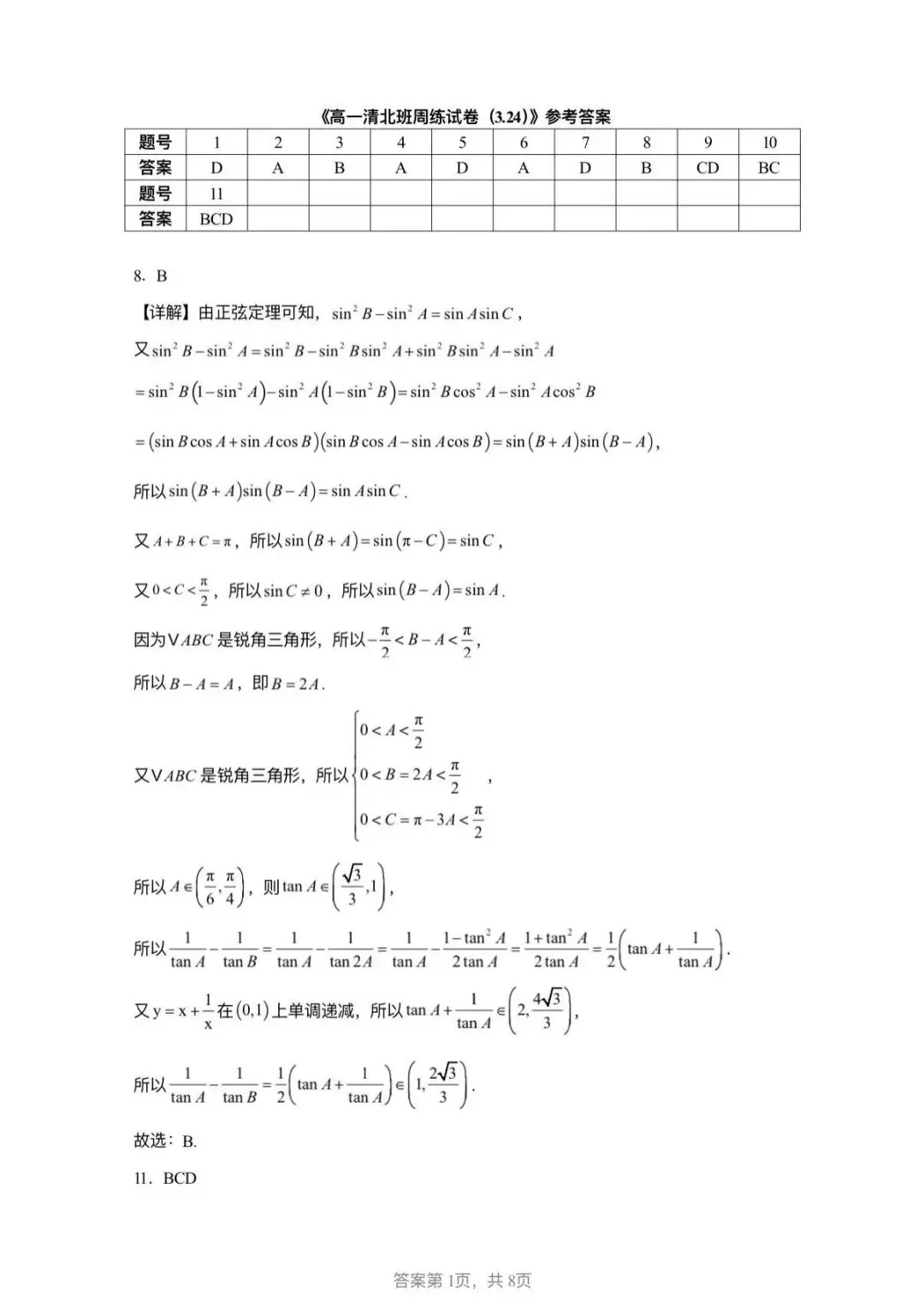 高一清北班周练数学试卷参考答案