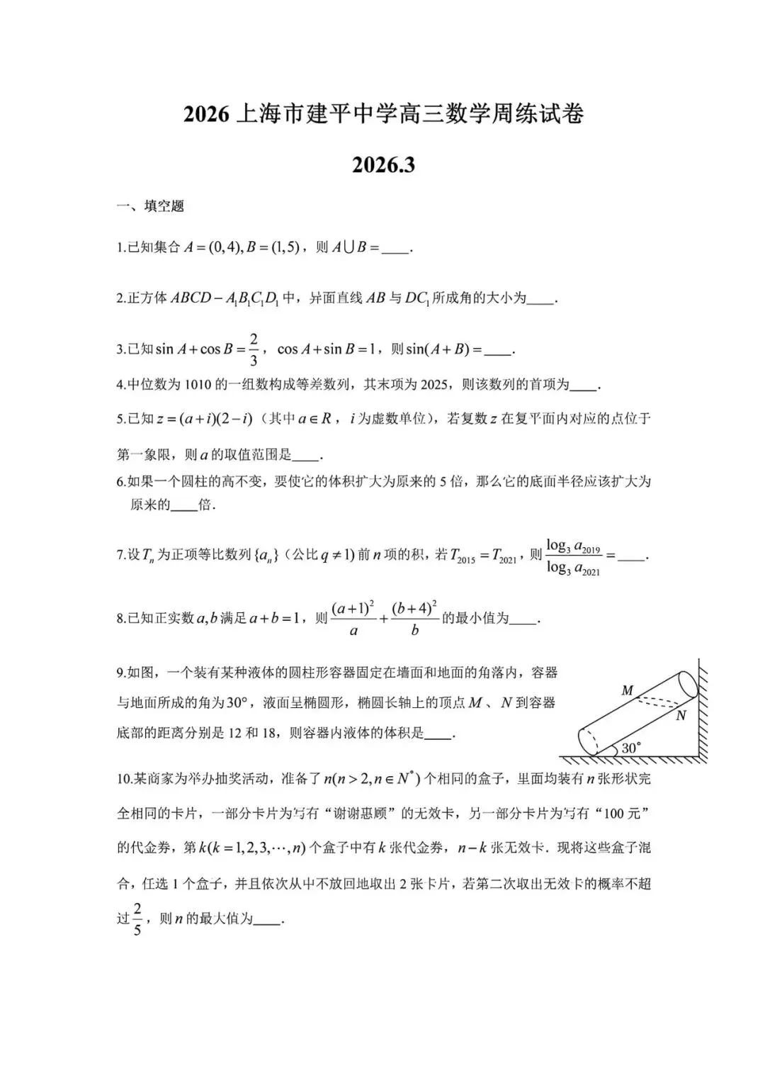 >上海市建平中学高三下学期数学周练试卷及答案(2026.3)