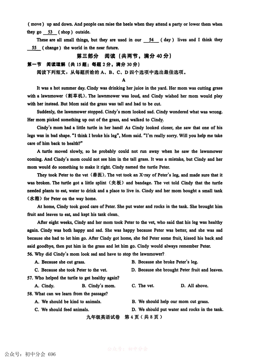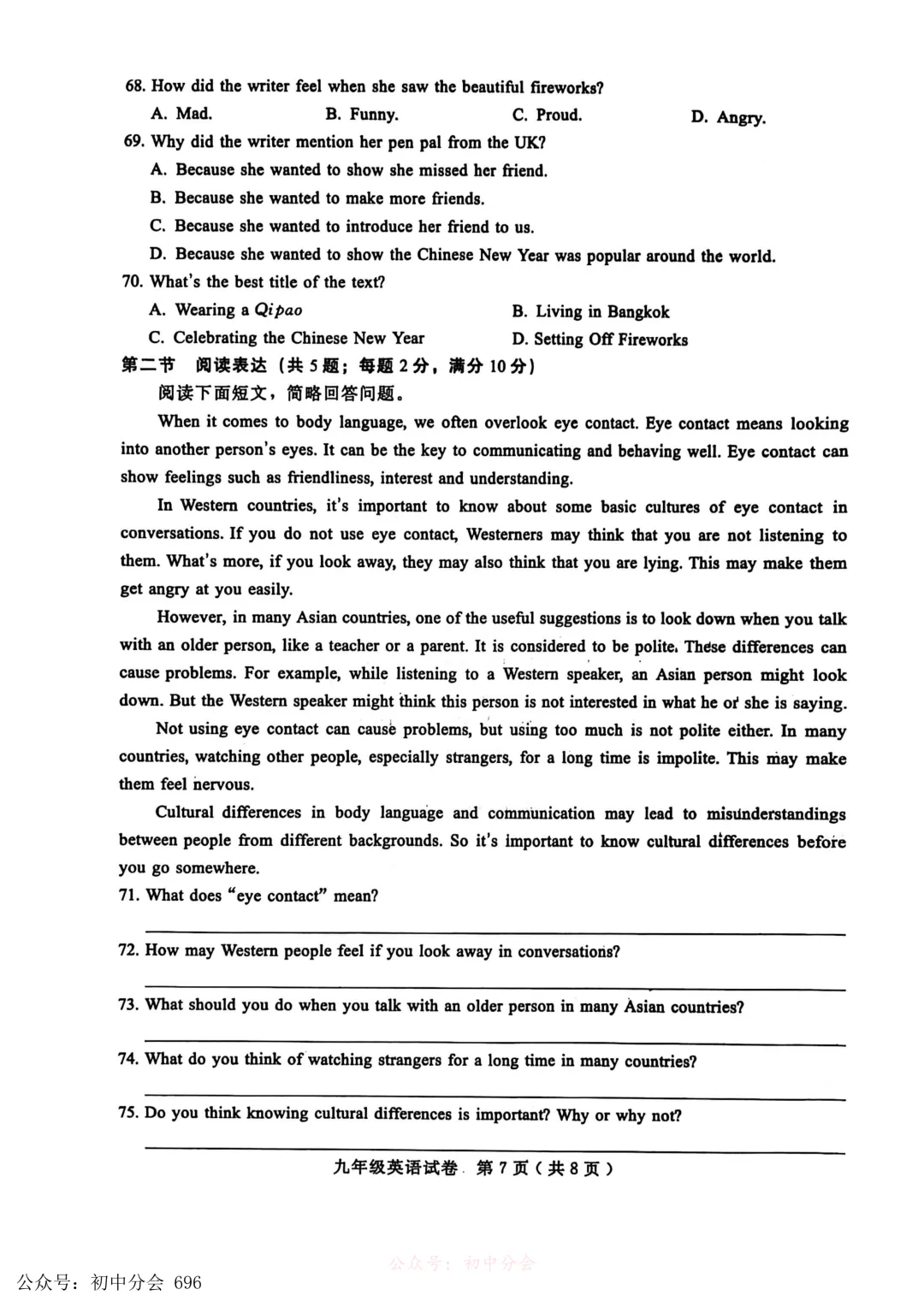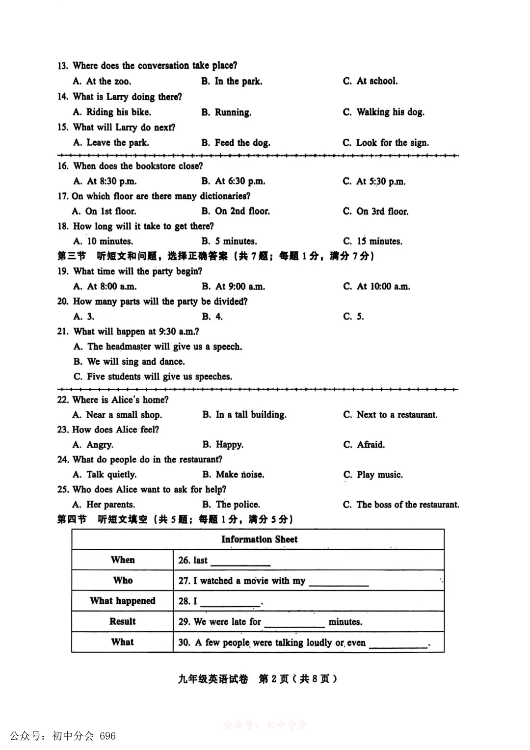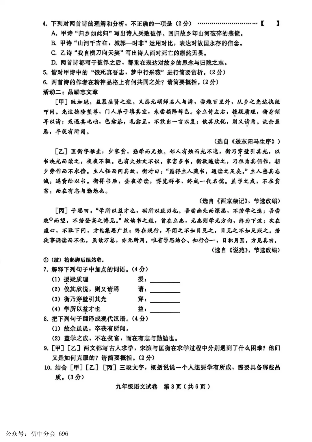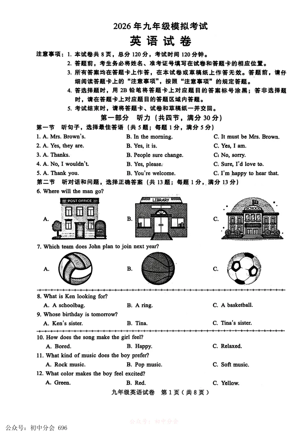 2026.3九年级中考摸底检测试卷及答案(全科含听力)