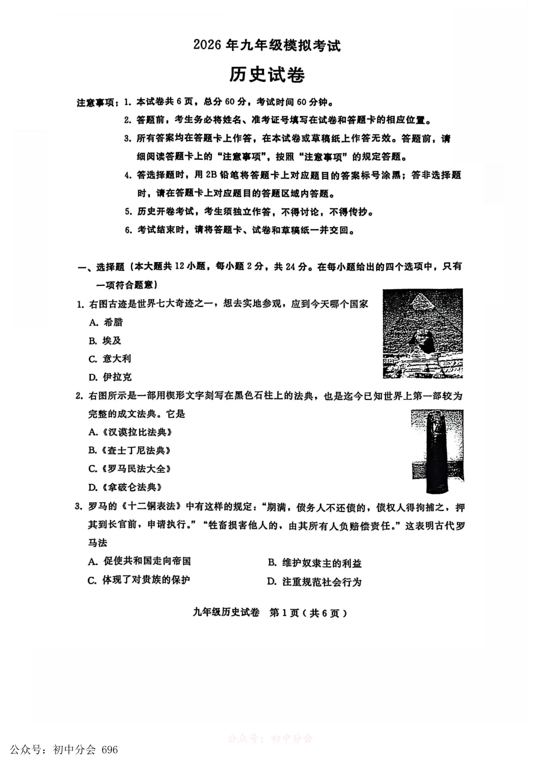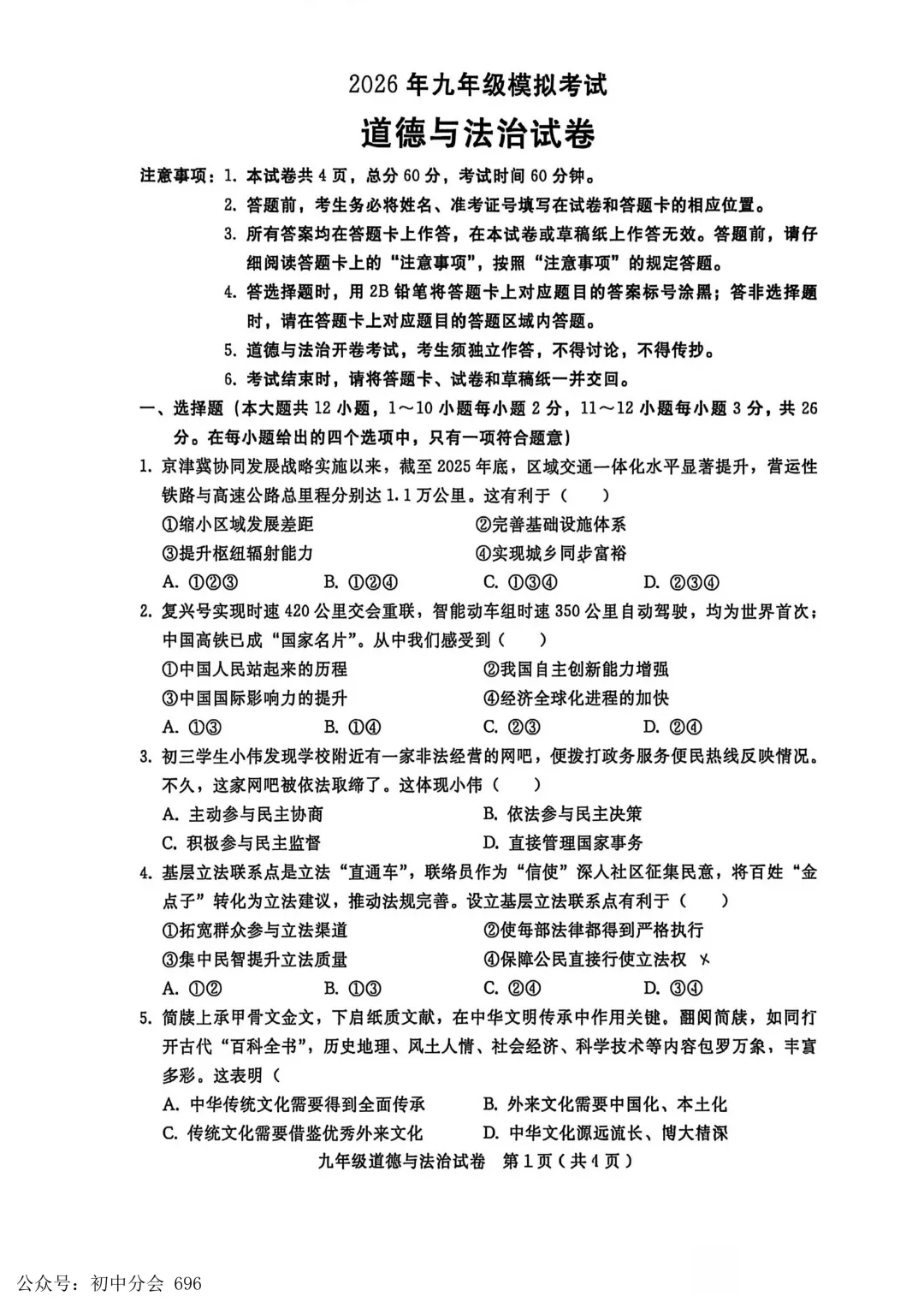 2026年初中学业水平测试模拟演练一试卷及答案(全科含听力)