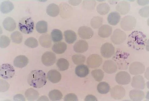 1.血涂片煌焦油蓝染色如图所示,标记序号1所指细胞为( )。