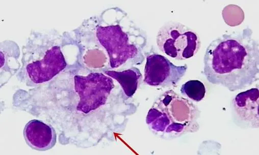 吞噬细胞具有吞噬衰老细胞和异物的功能,细胞体积大,胞质丰富,核圆形、卵圆形或肾形,略偏位,染色质均匀细致,偶见核仁,图为吞噬细胞。