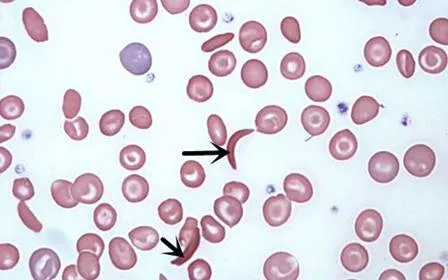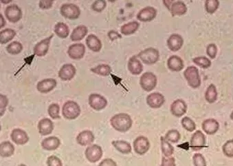 镰形红细胞:细胞呈镰刀状、线条状或L、S、V形等,是含有异常血红蛋白S(HbS)的红细胞。见于镰状细胞贫血、镰状细胞特性样本。
