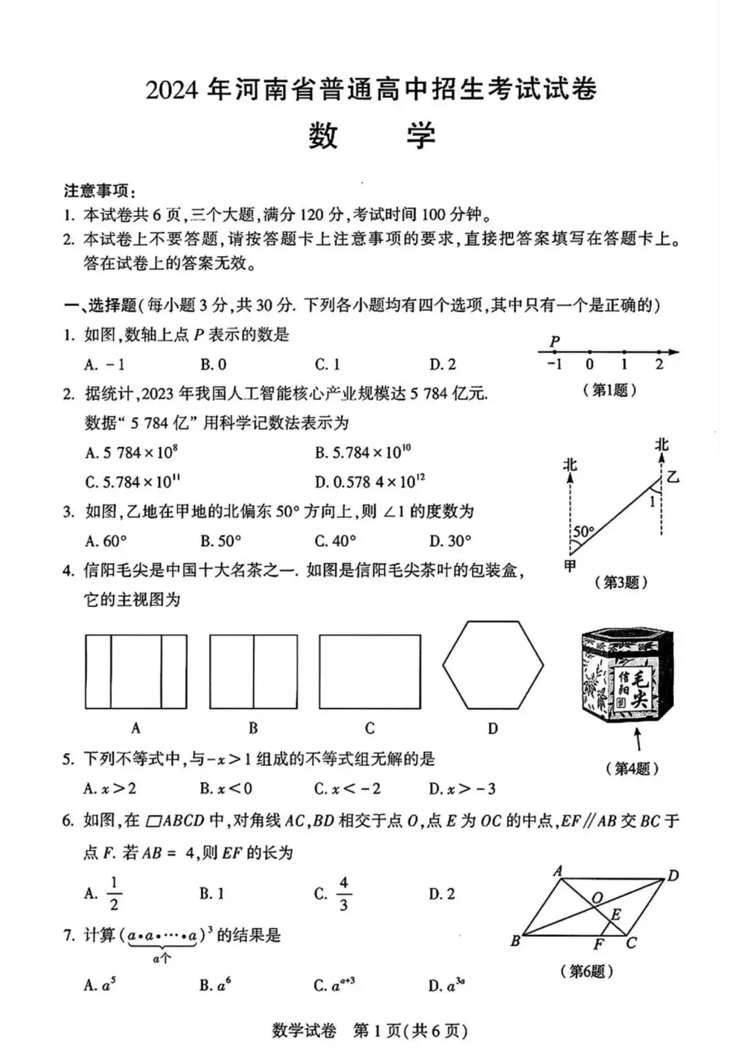 >2024年河南省普通高中招生考试试卷(数学)