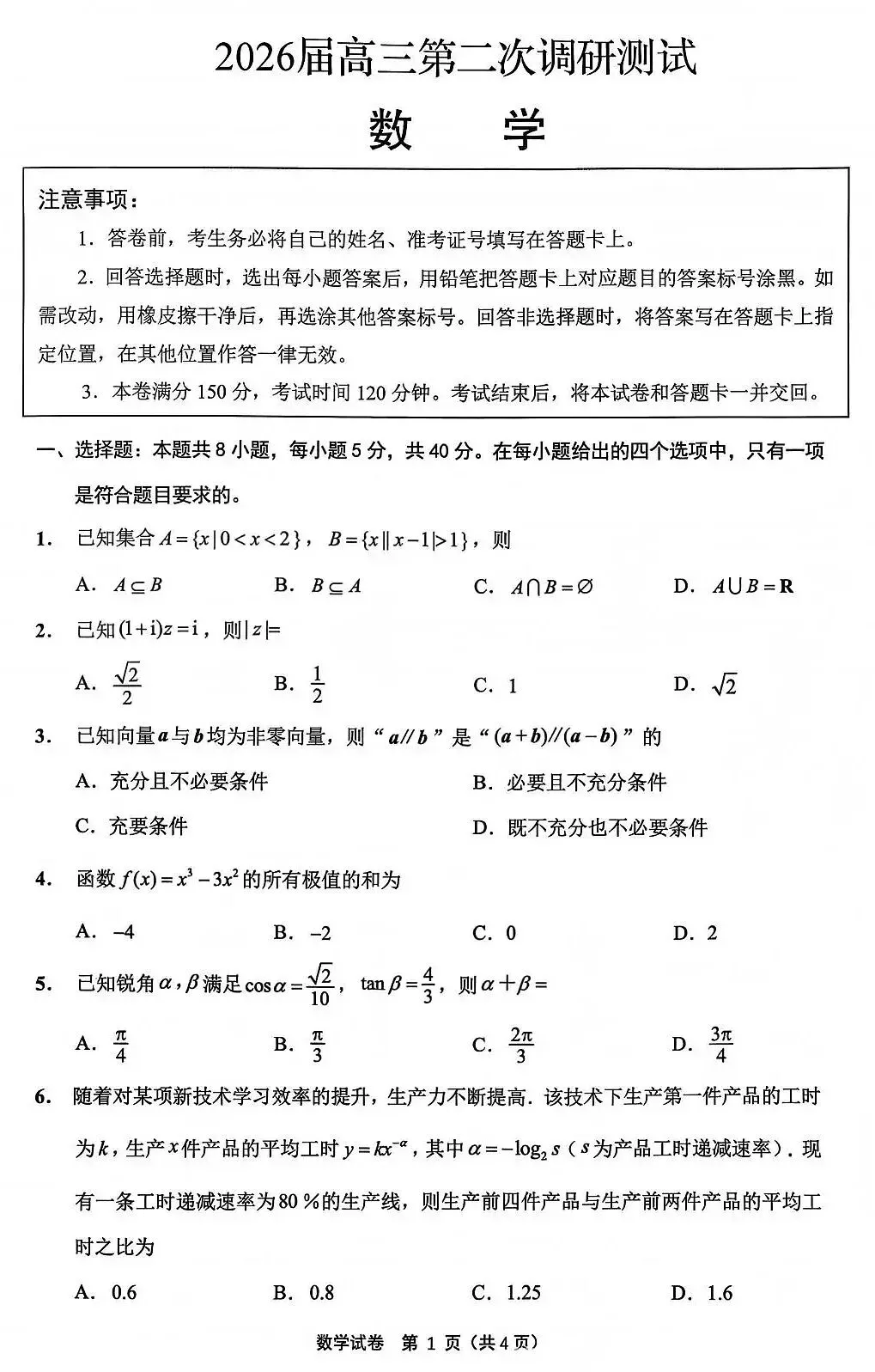 2026南通二模数学试卷+参考答案!(苏北七市:南通、连云港、扬州、徐州、淮安、宿迁、泰州-二模数学)