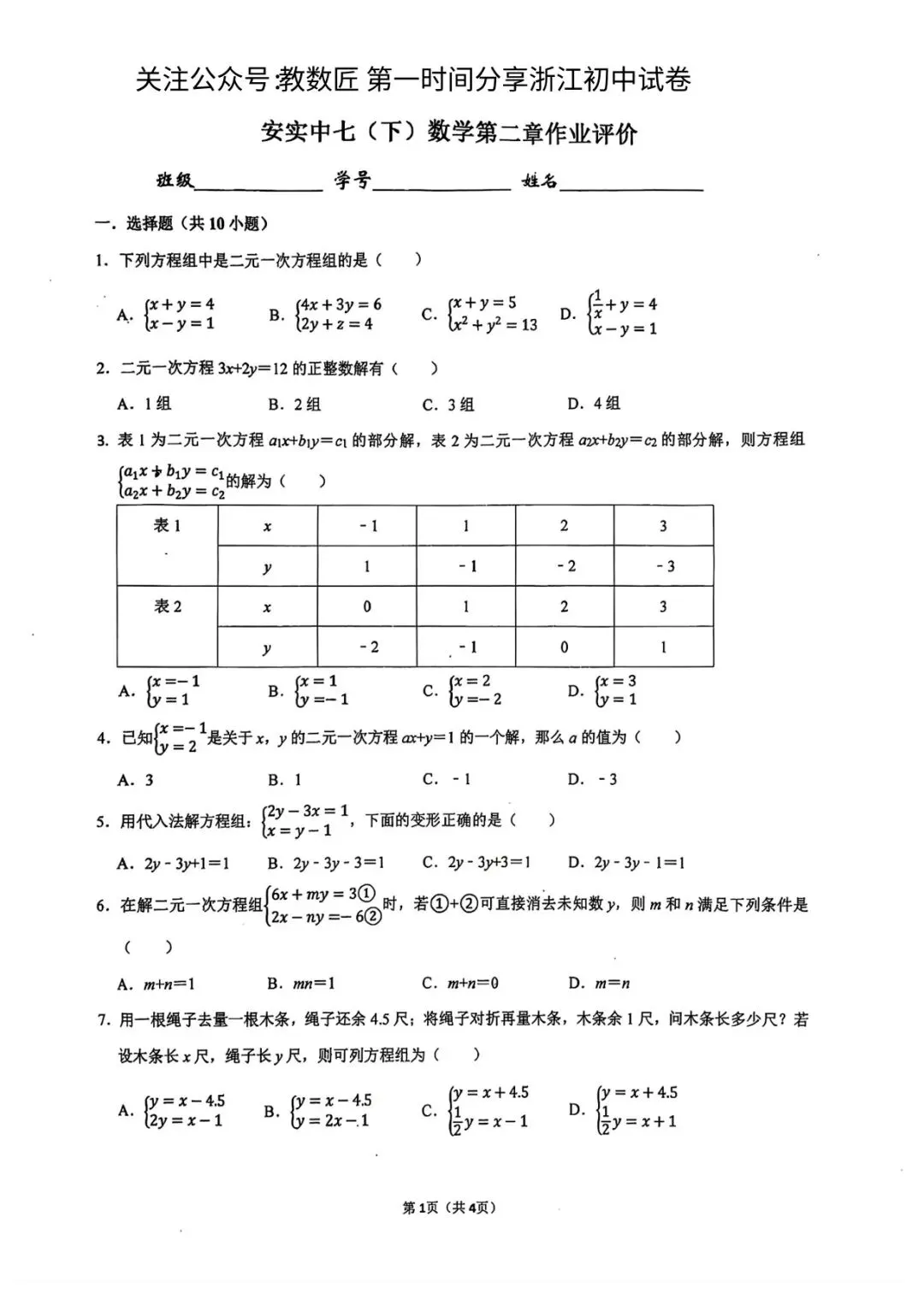 【2026浙江试卷】瑞安市安阳实验中学七下第二单元测试(2026.3)