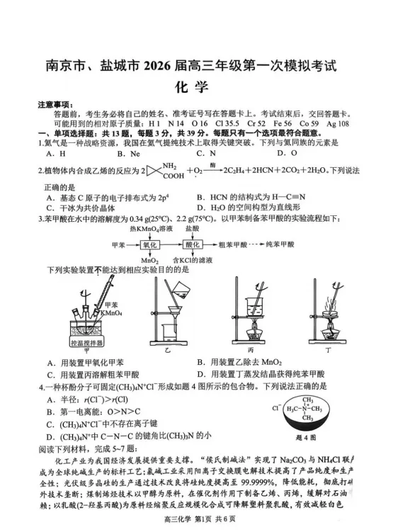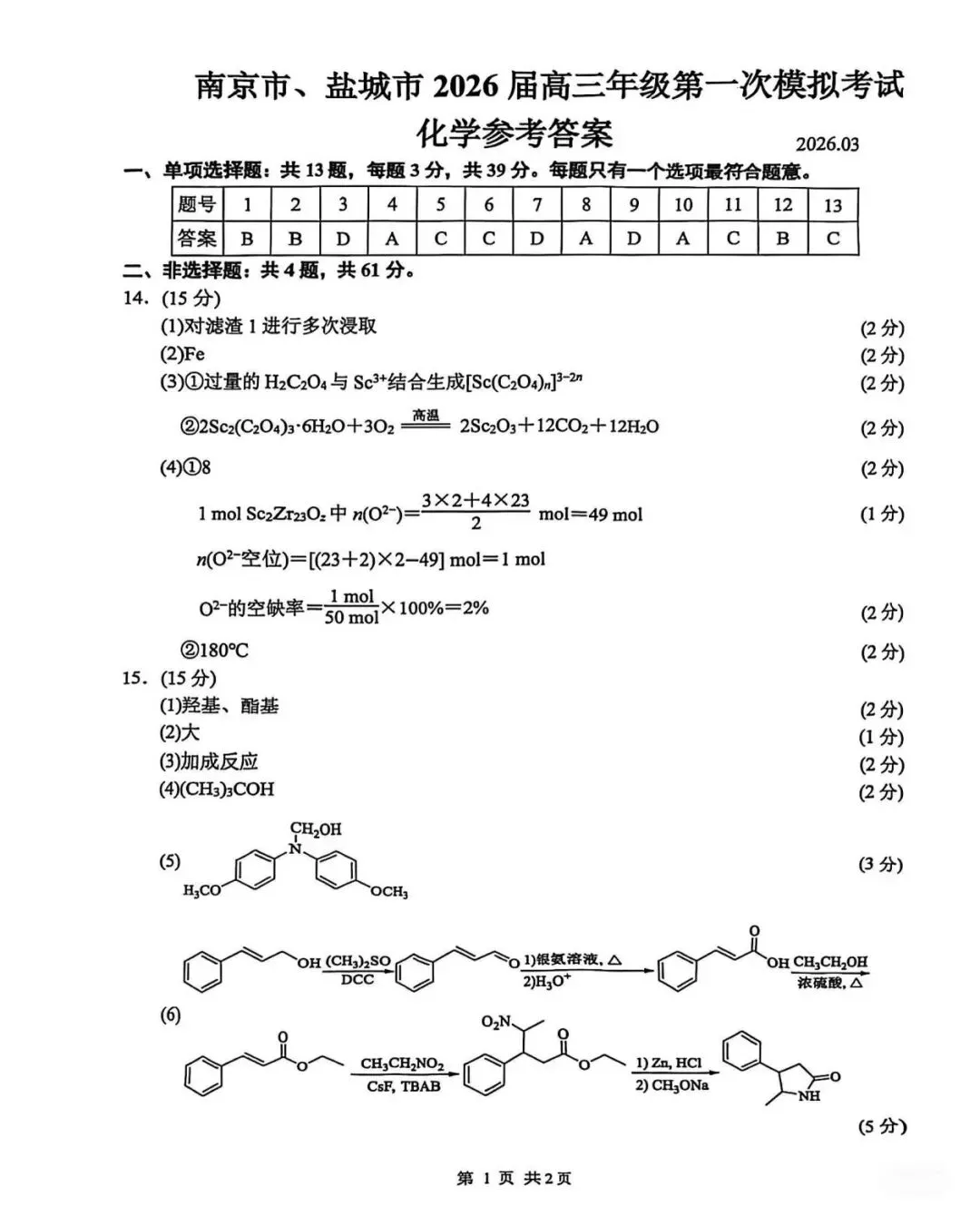 盐城南京二模化学试卷整体难度不小,主要考察学生基本知识掌握能力和实验探究能力,试卷覆盖范围全面,整体质量较高。