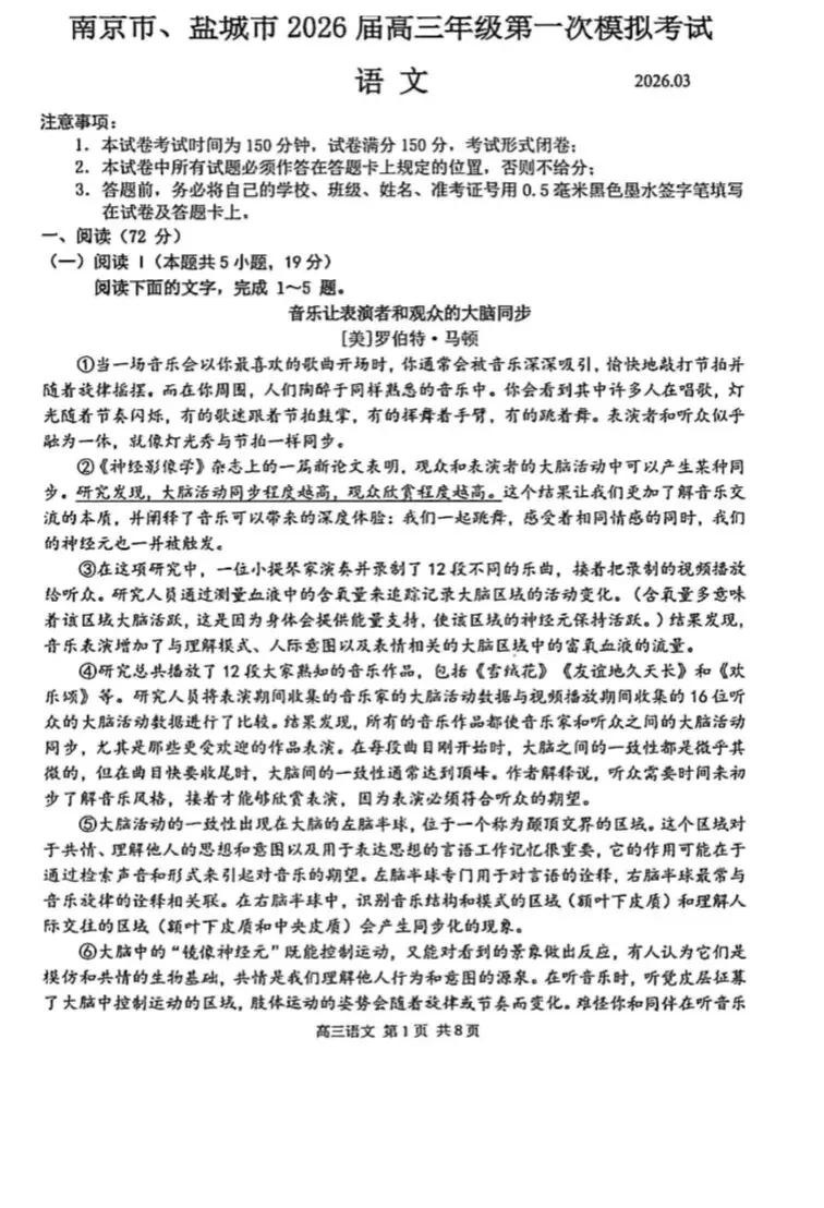 最新!2026届高三南京盐城一模语文试卷,附作文范文