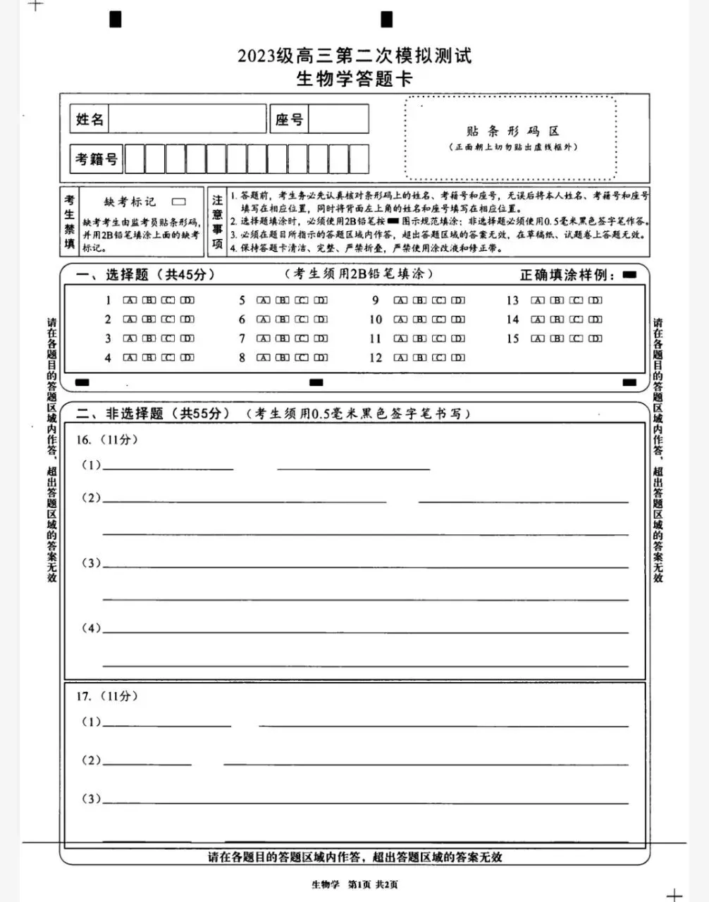 【含答题卡】2026年成都二诊生物试卷+评分标准+答题卡