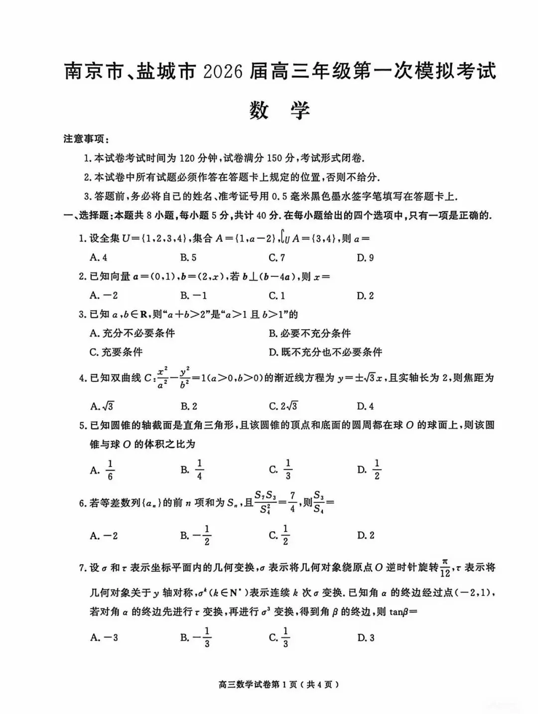 >2026届高三数学-南京3月二模数学试卷