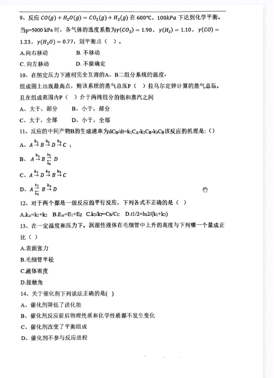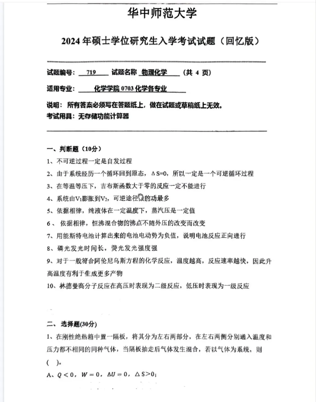 >华中师范大学24物理化学考研真题