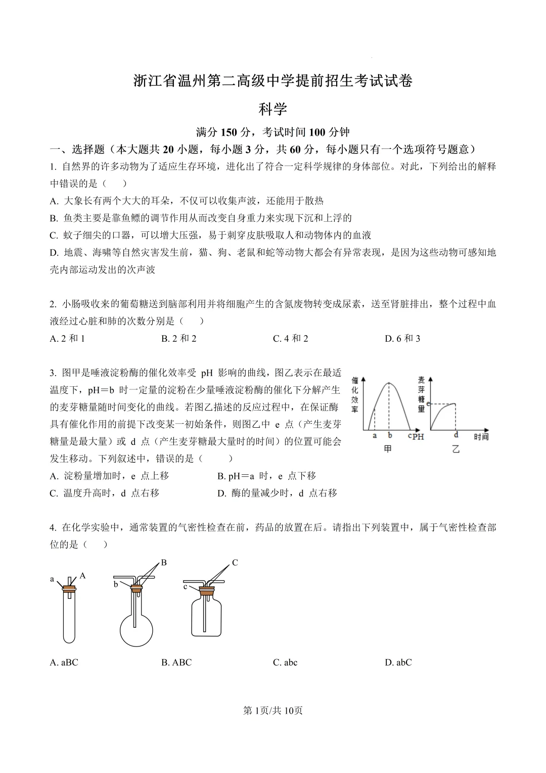 >浙江省温州第二高级中学提前招生考试试卷(科学)