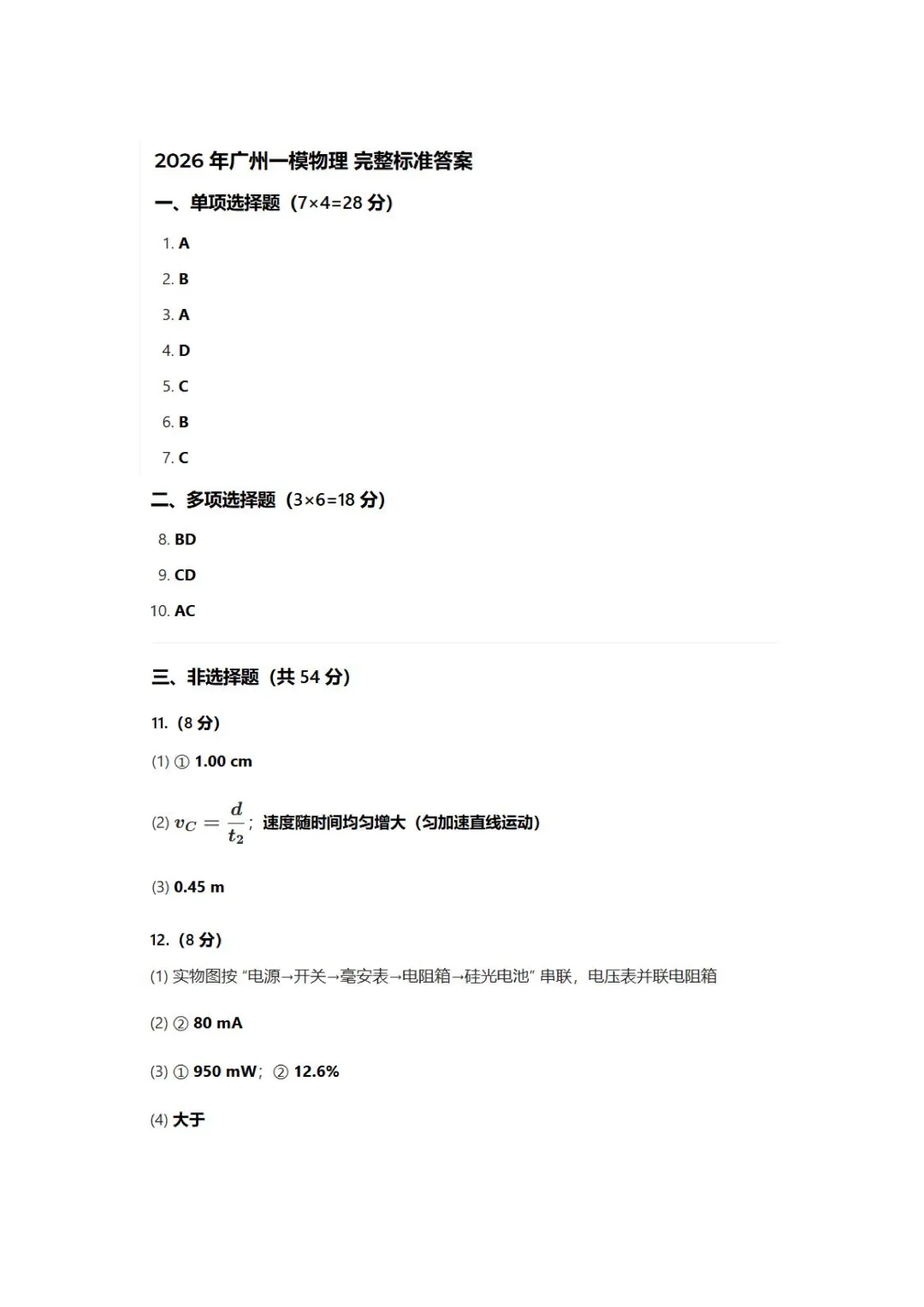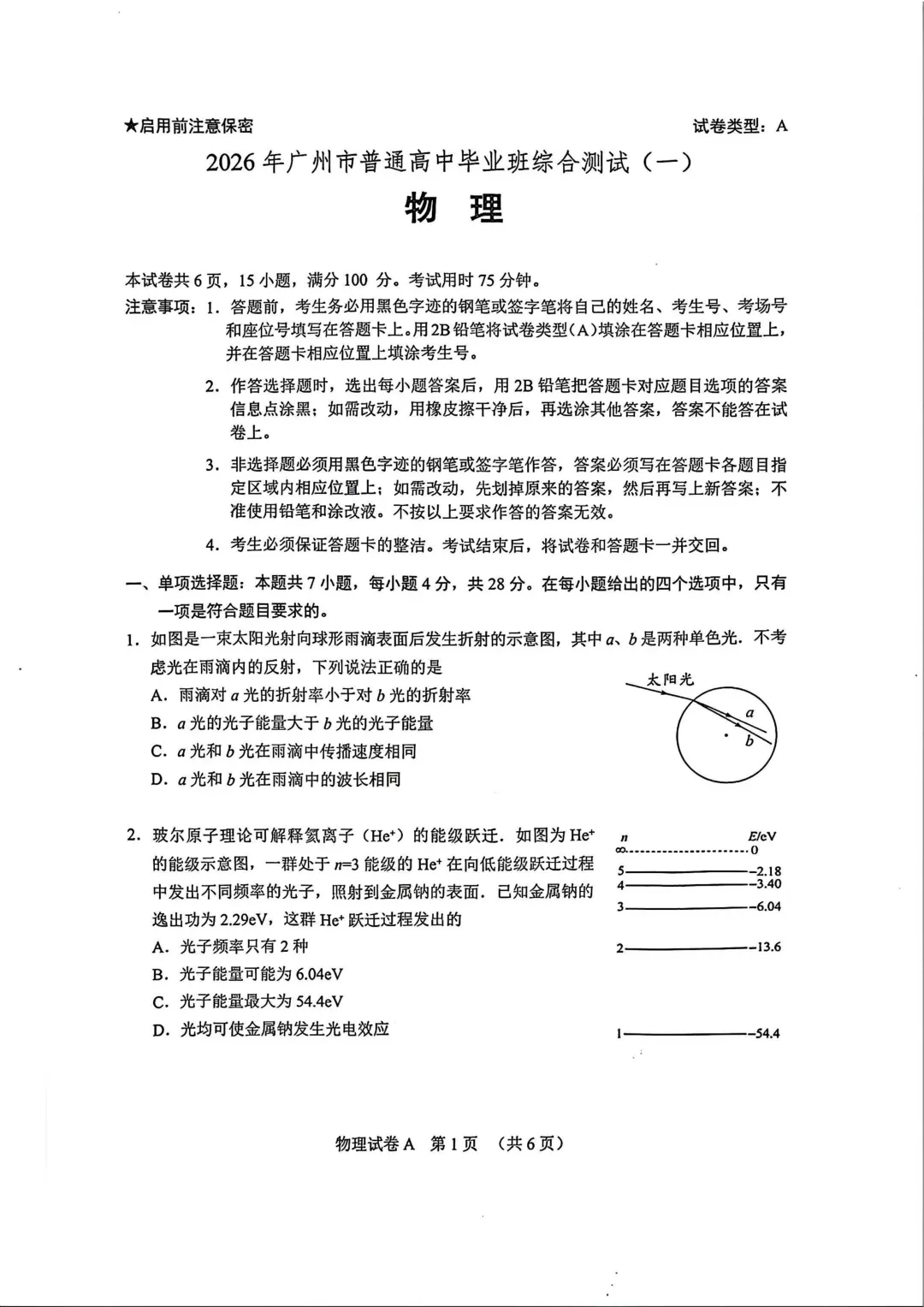 2026届广州市高三毕业班综合测试(一)物理