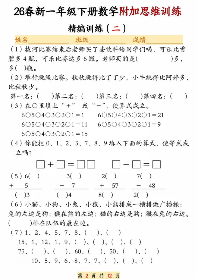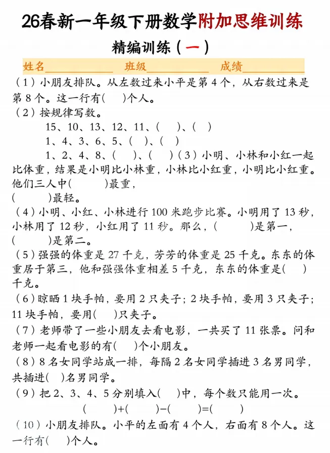 一年级数学下册【试卷附加题思维训练题】课内拓展练习