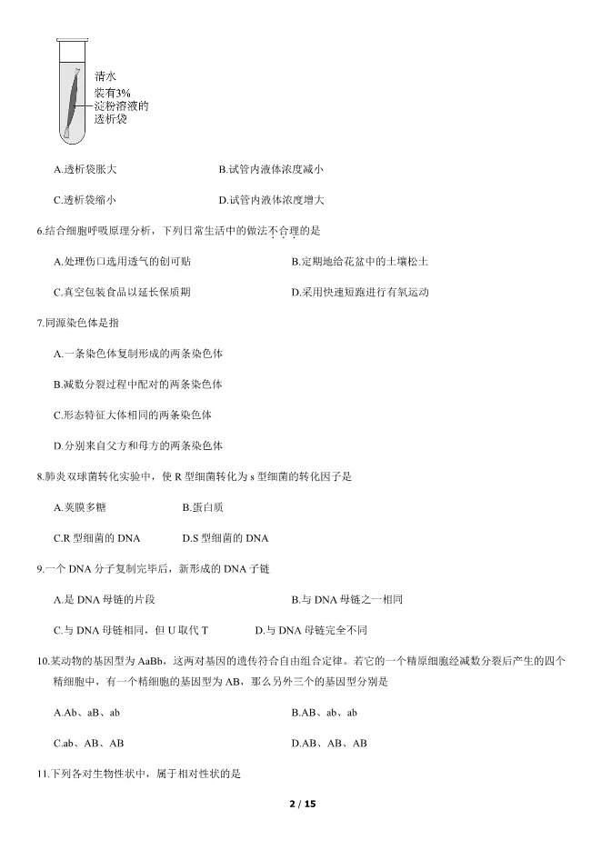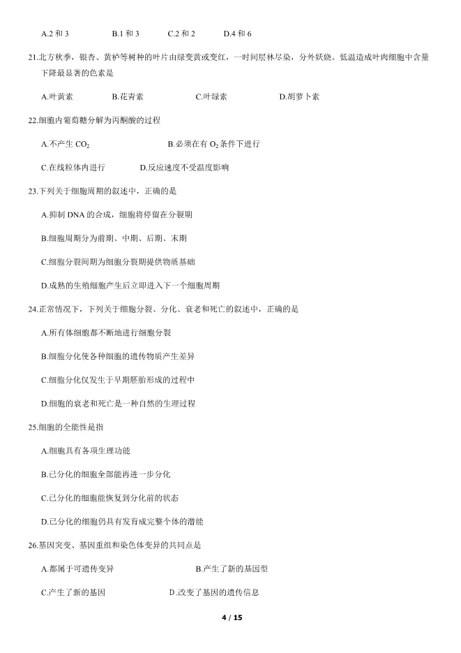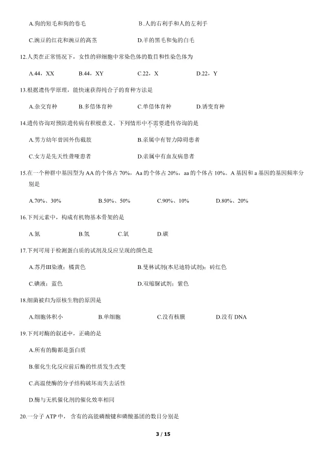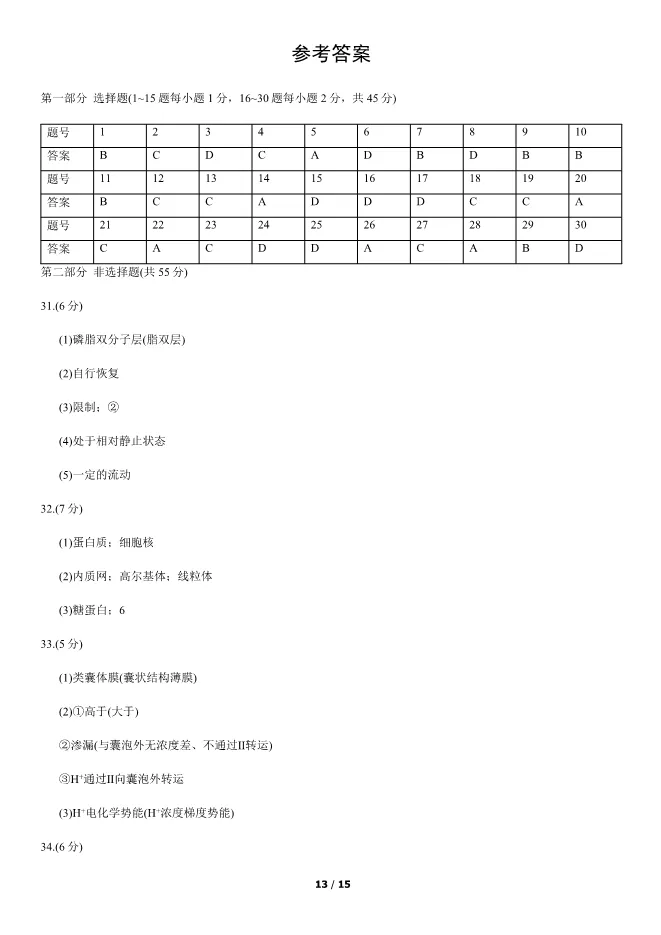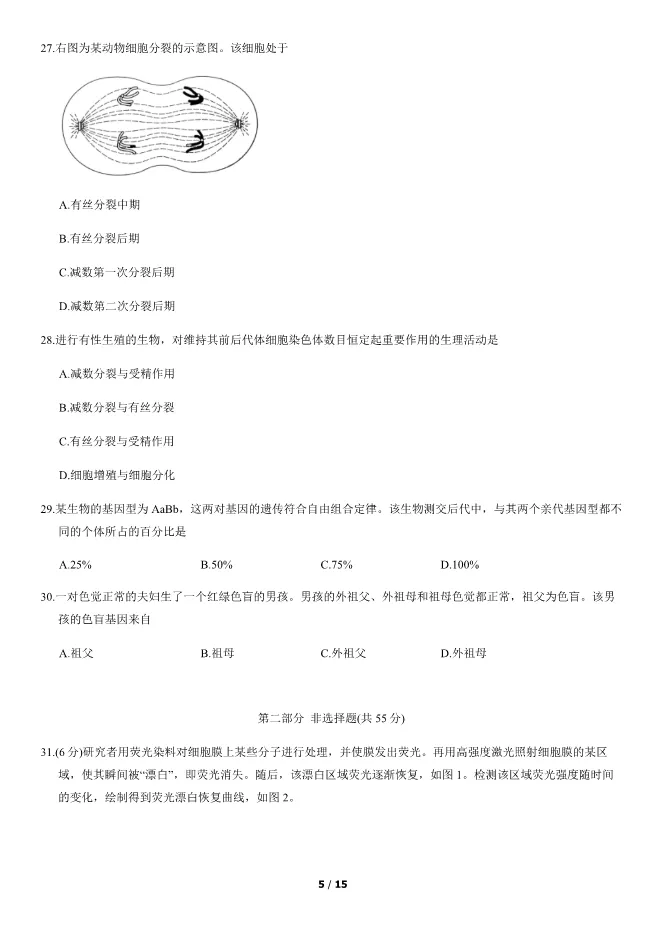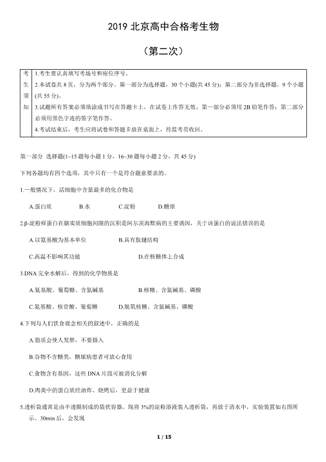 2019北京高中合格考生物试卷生物会考真题(第二次有答案) 电子版试卷获取,后台回复:试卷