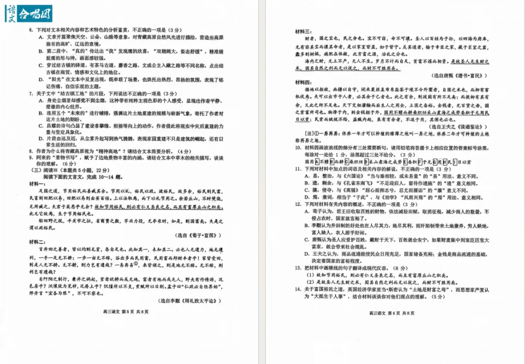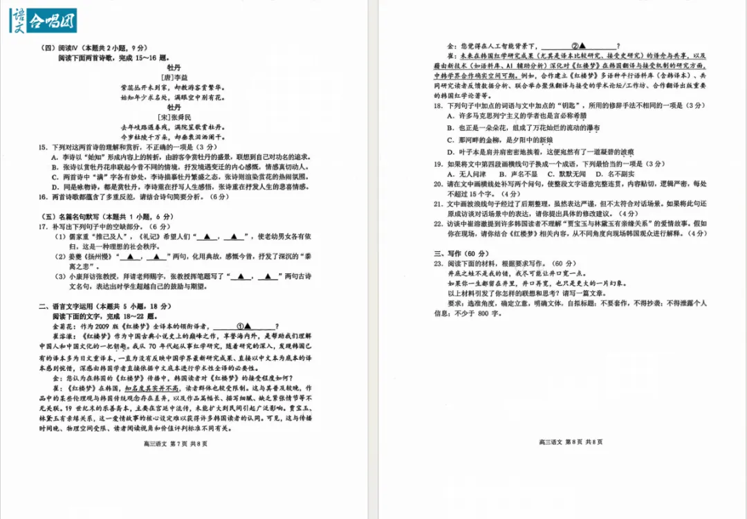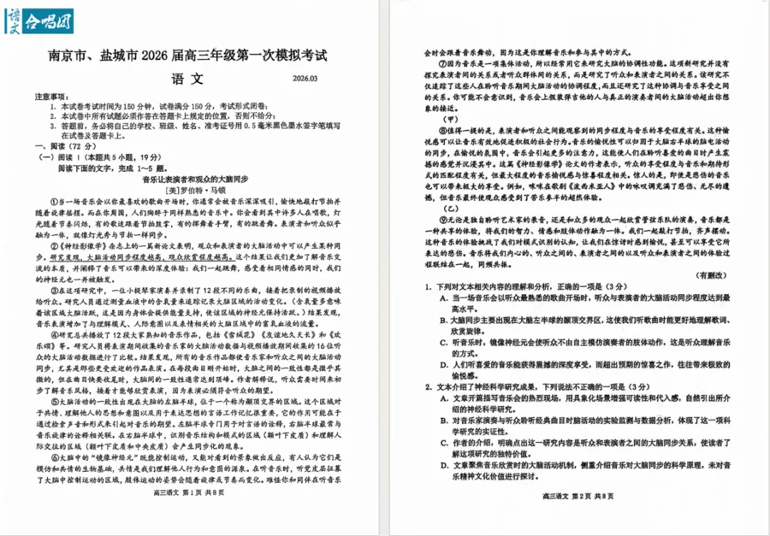 2026届南京市、盐城市一模语文试卷 | pdf下载(另赠数学卷、化学卷)