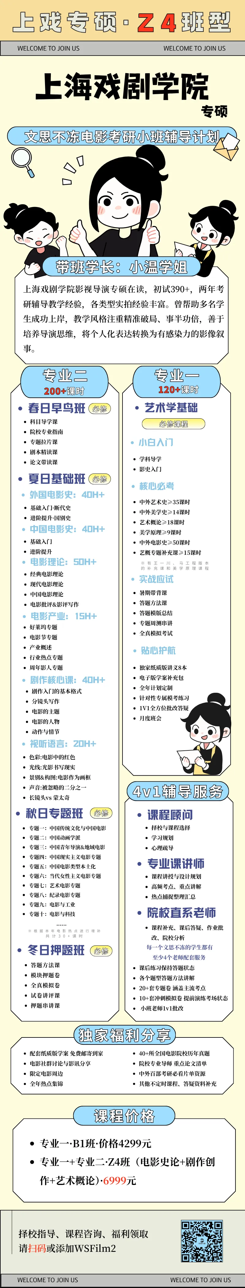 上戏影导MFA相关备考资料文思不冻已经为大家打包整理好啦,将本篇推文三连(评论、点赞、转发至朋友圈)后带截图私信添加七七学姐微信(WSFilm2),🉑获得院校备考资源大礼包!