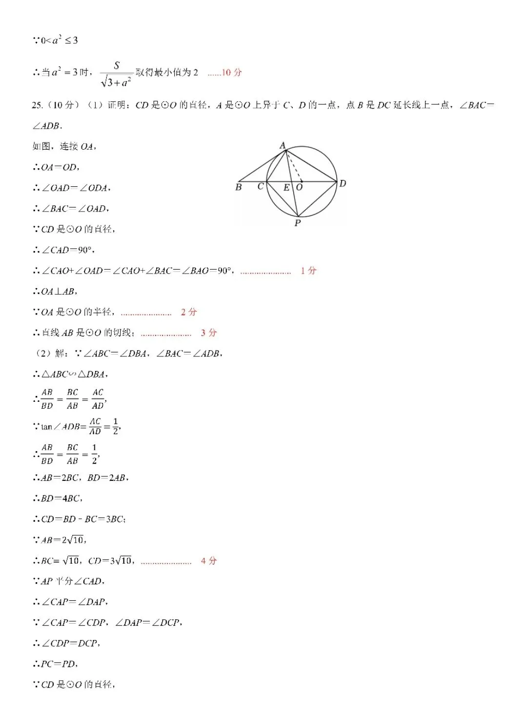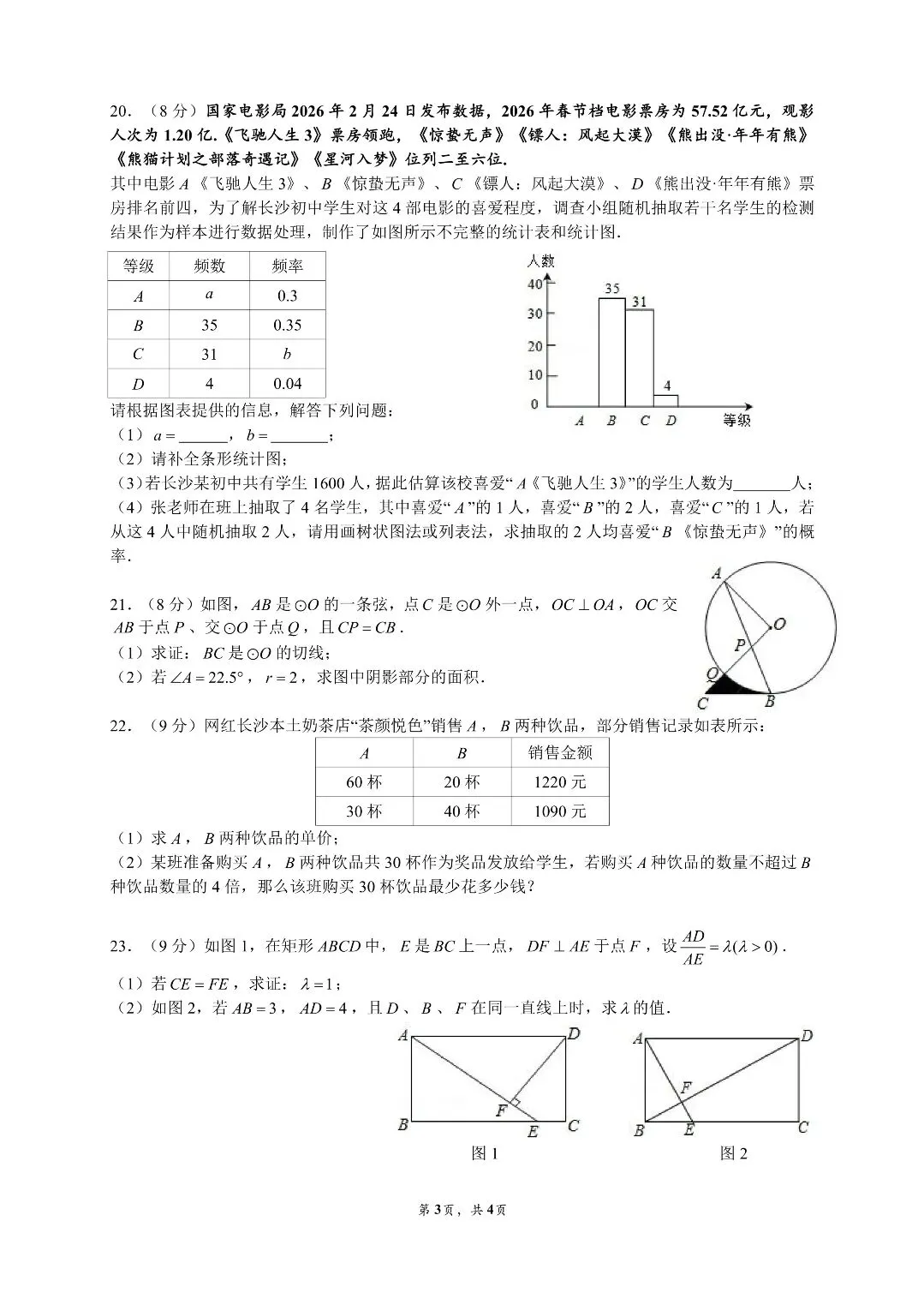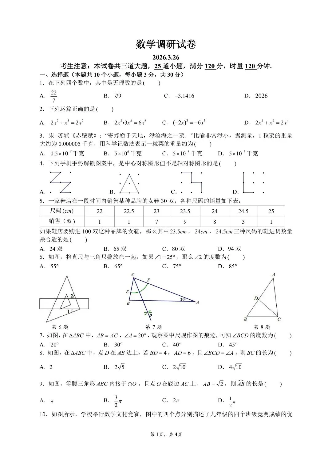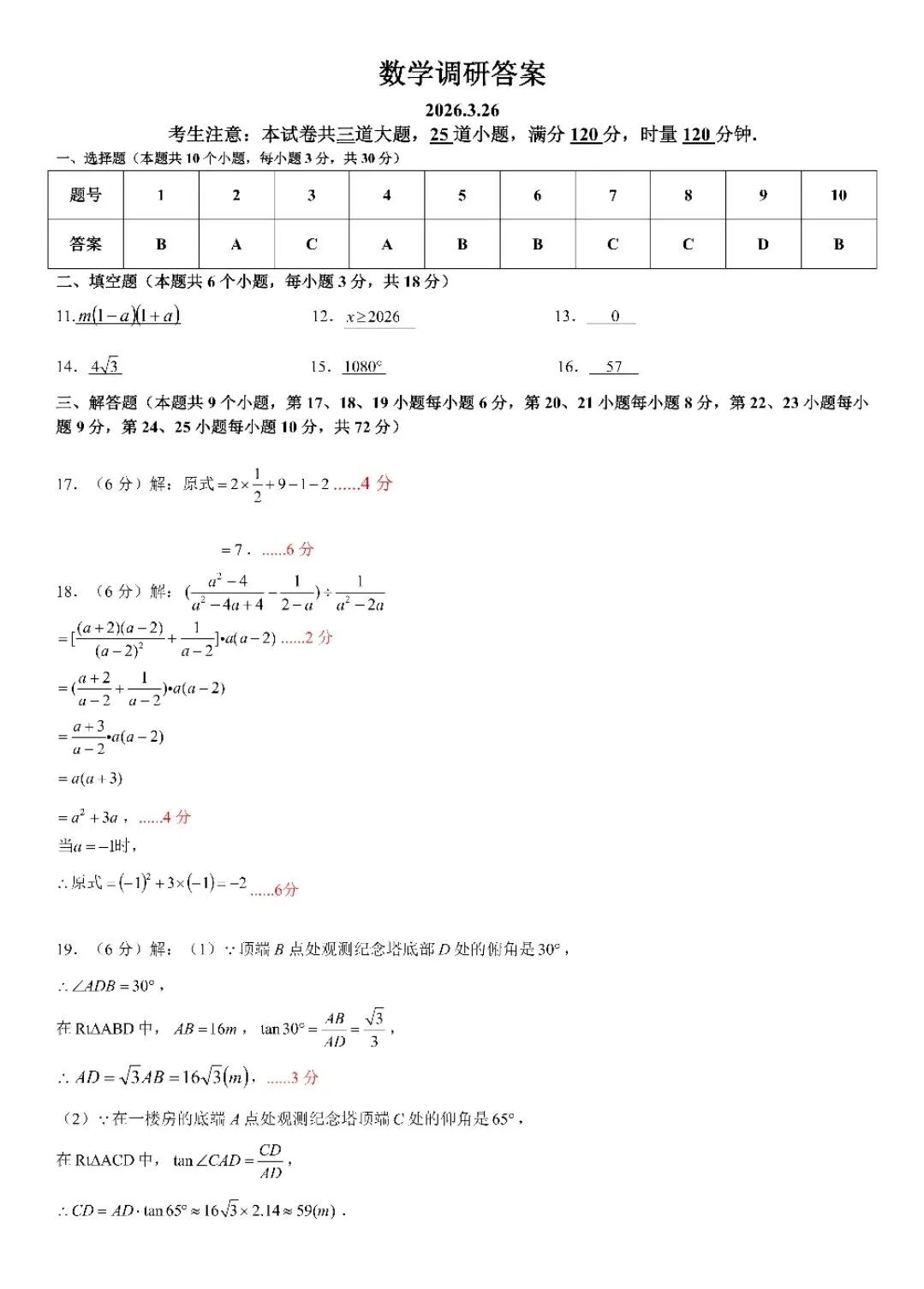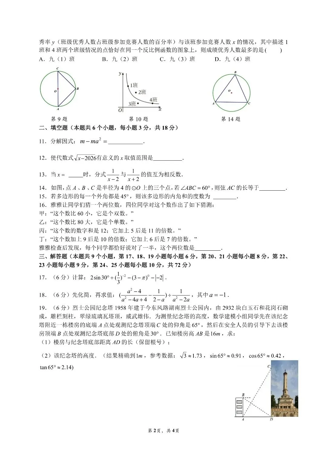 >2025~2026年中雅初三一模数学试卷及答案分享