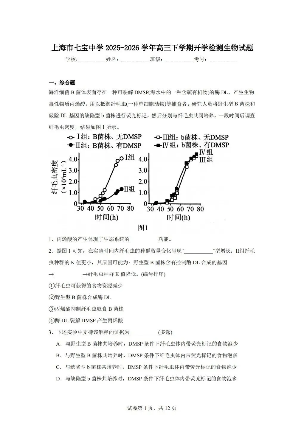 >《试卷分享》高三下学期生物测试卷