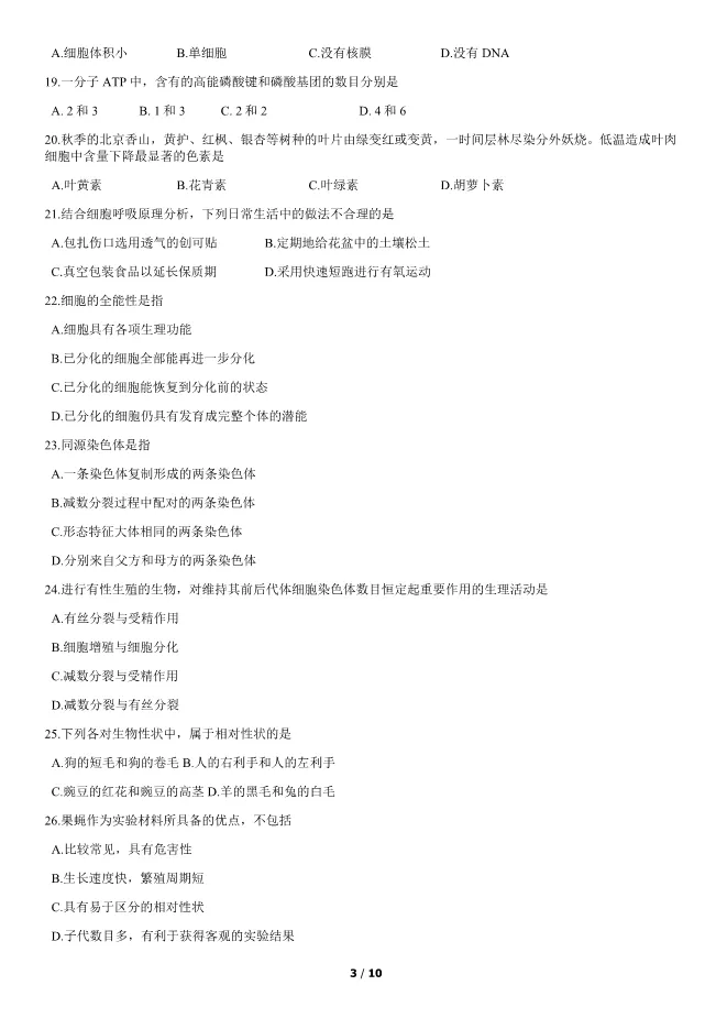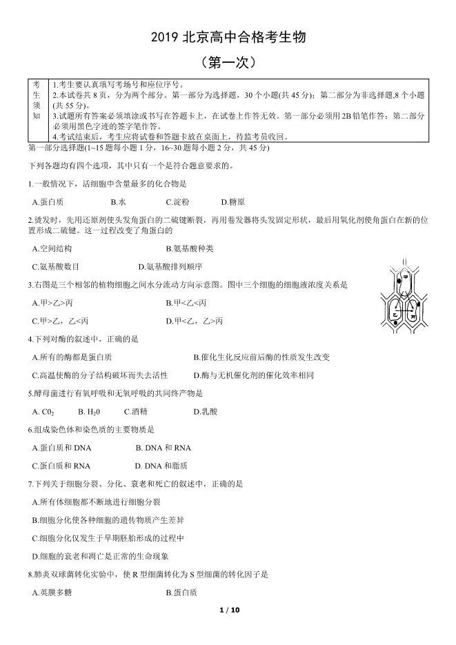 >2019北京高中合格考生物试卷生物会考真题(第一次有答案)【可下载】