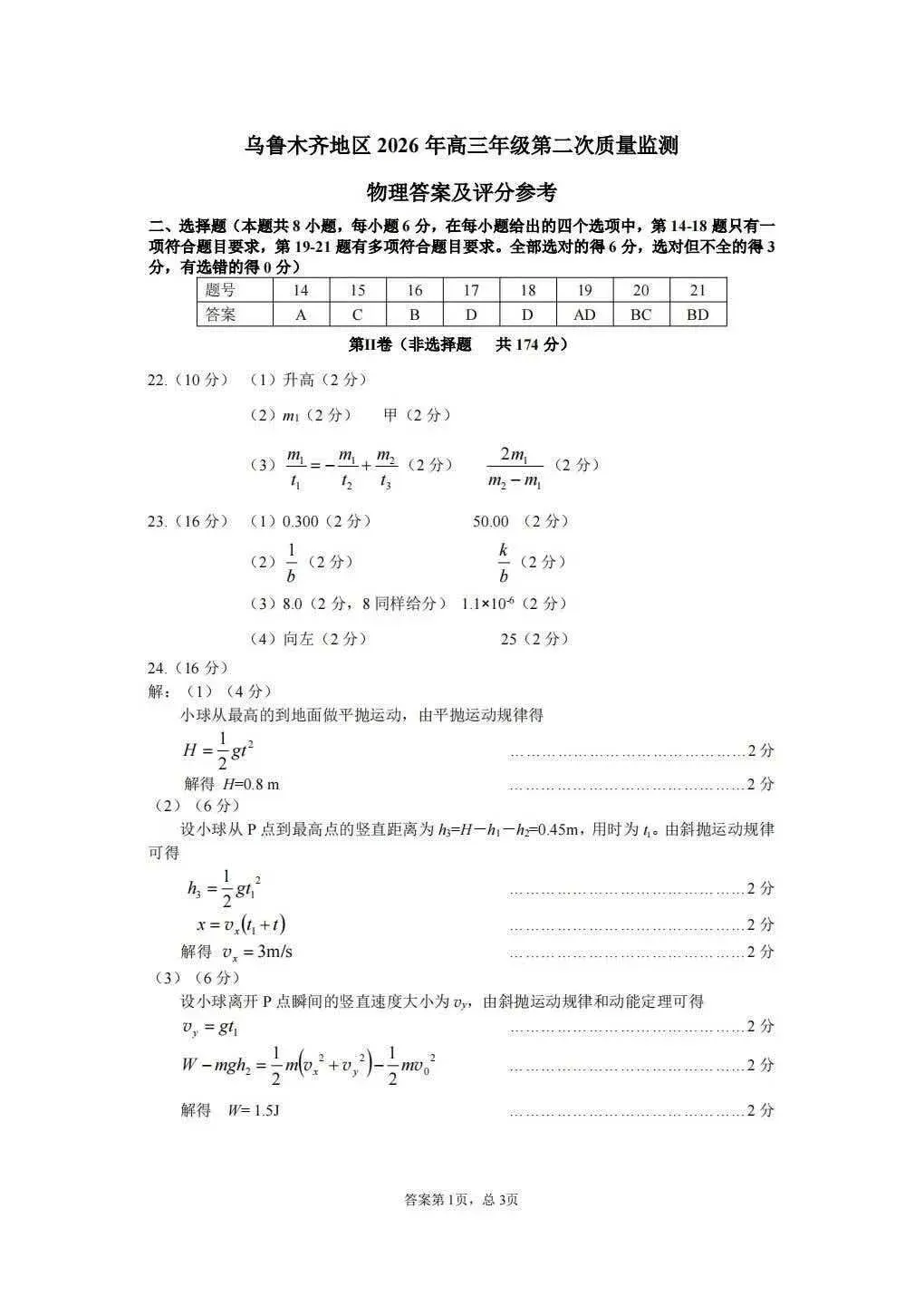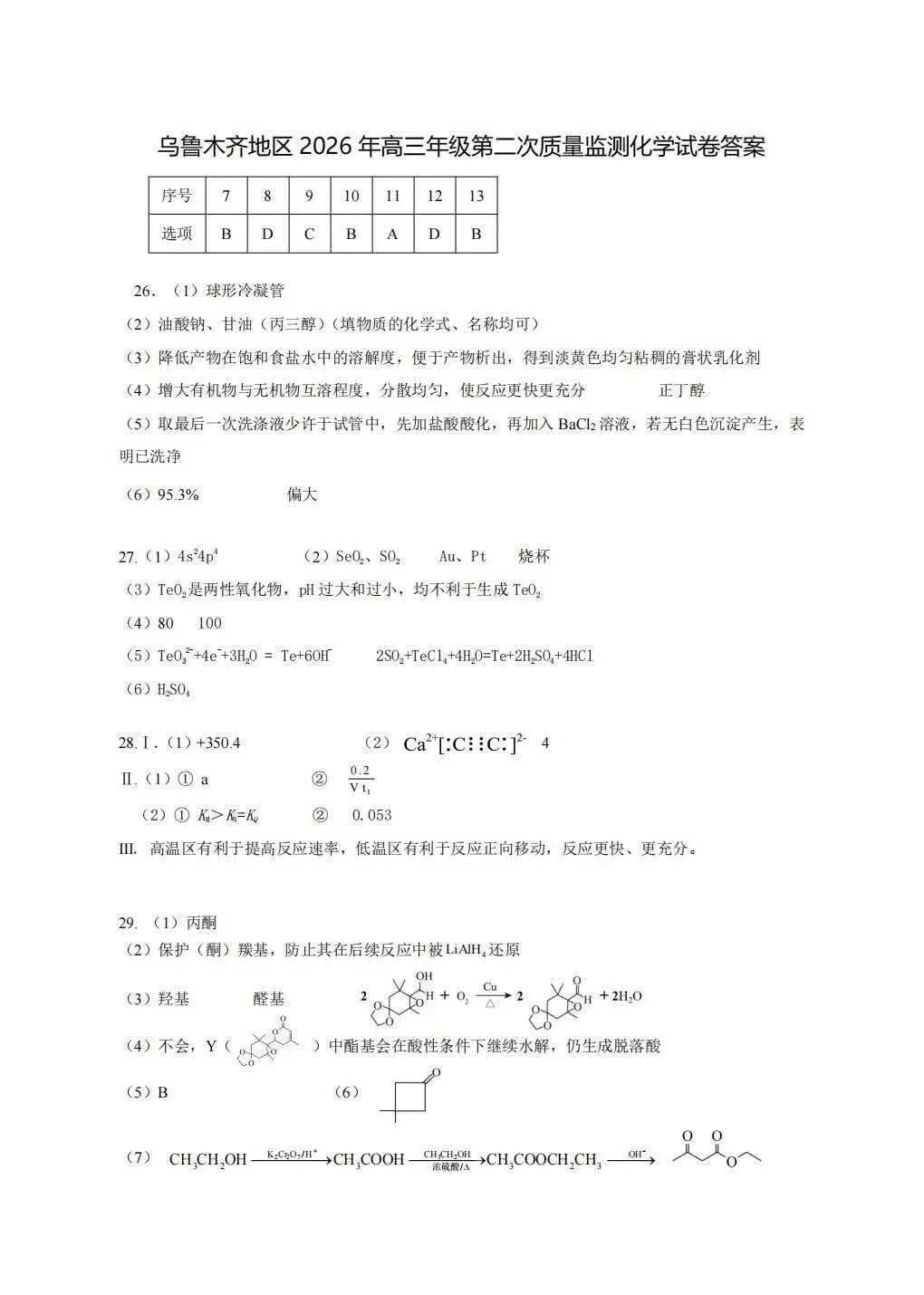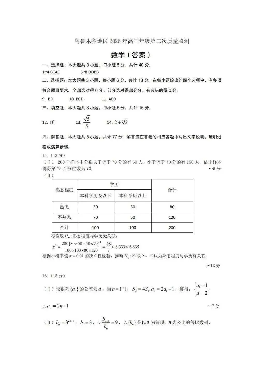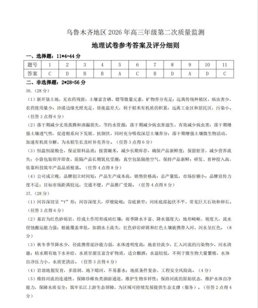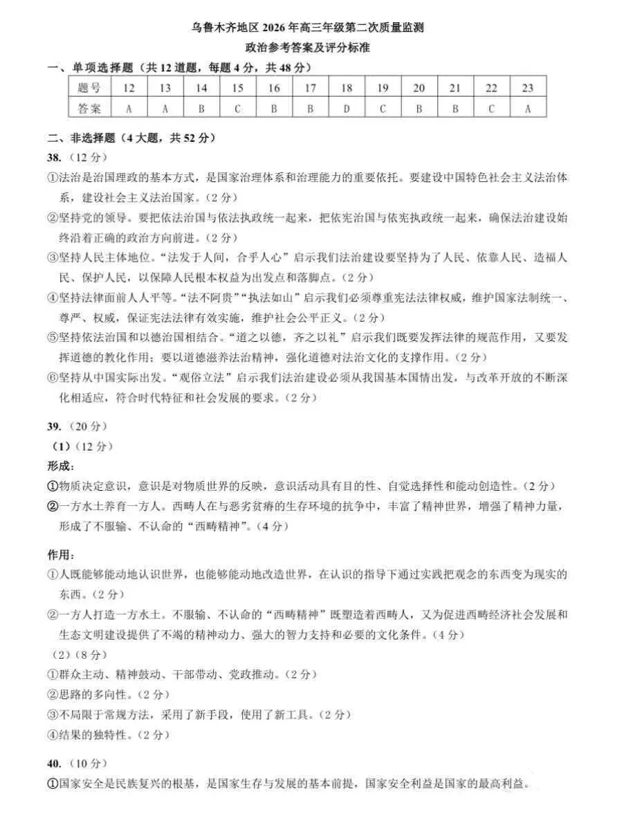 >全科试卷答案!乌鲁木齐2026年高三年级第二次质量监测参考答案