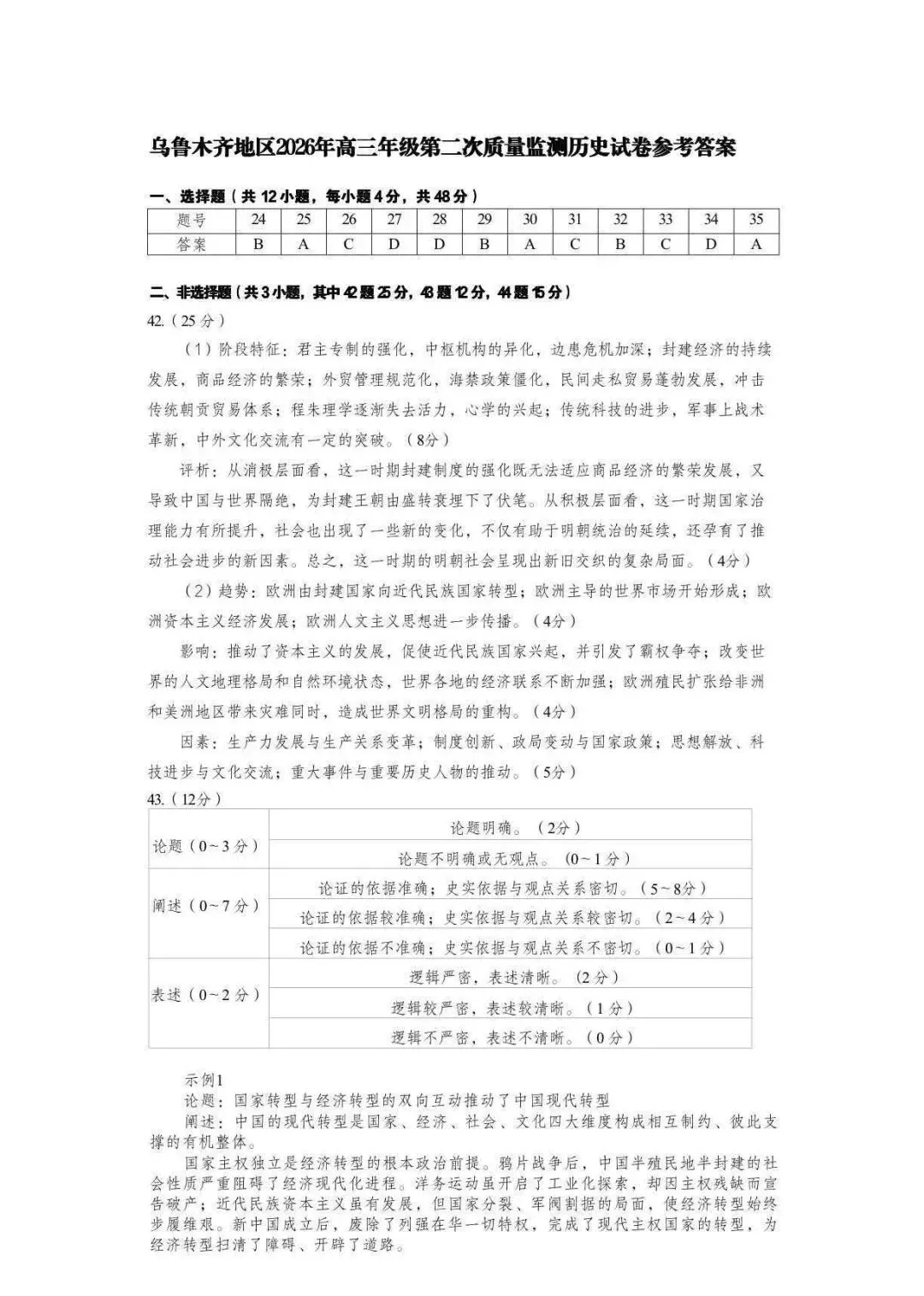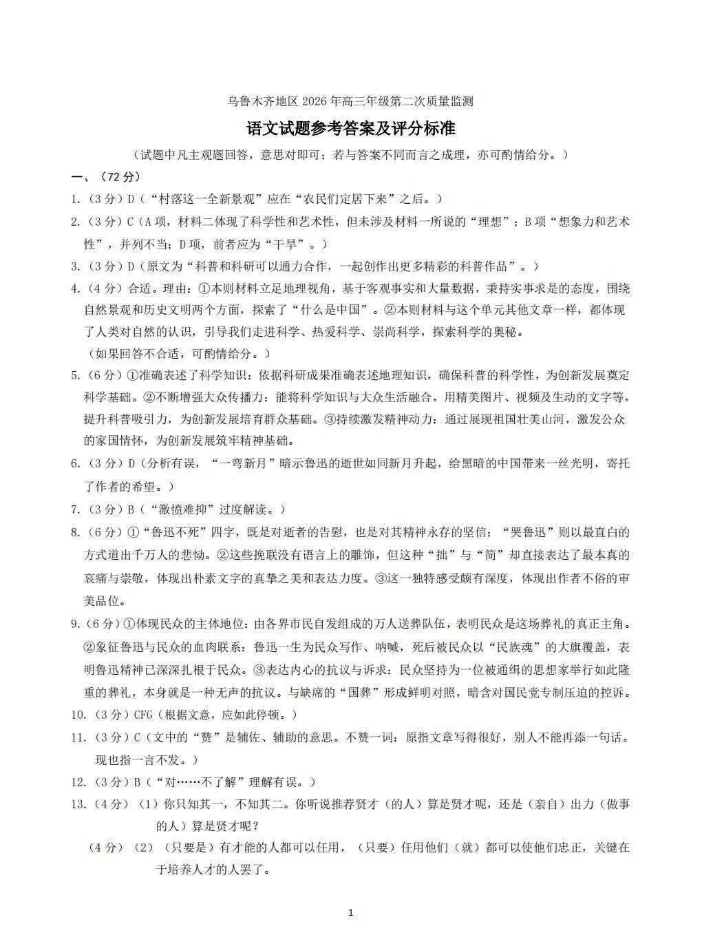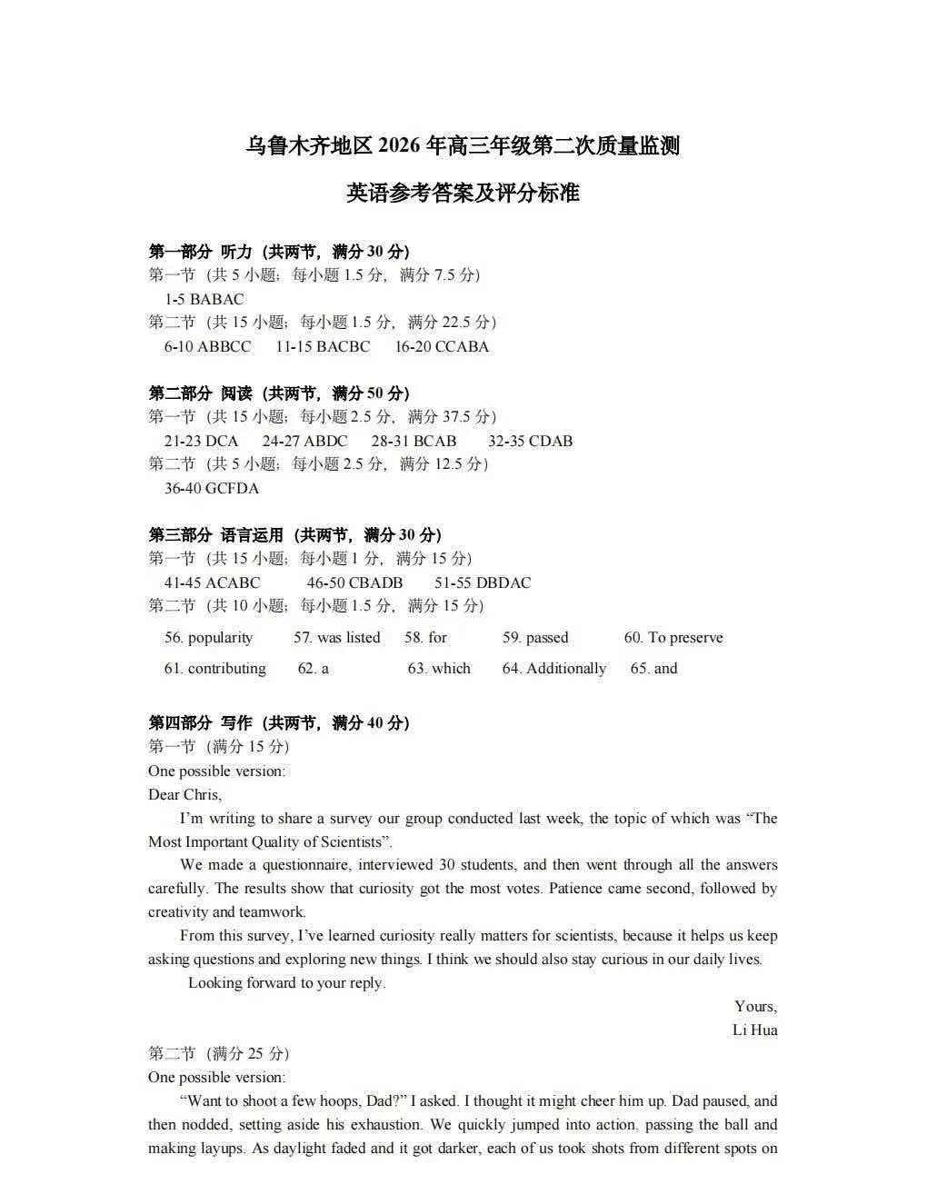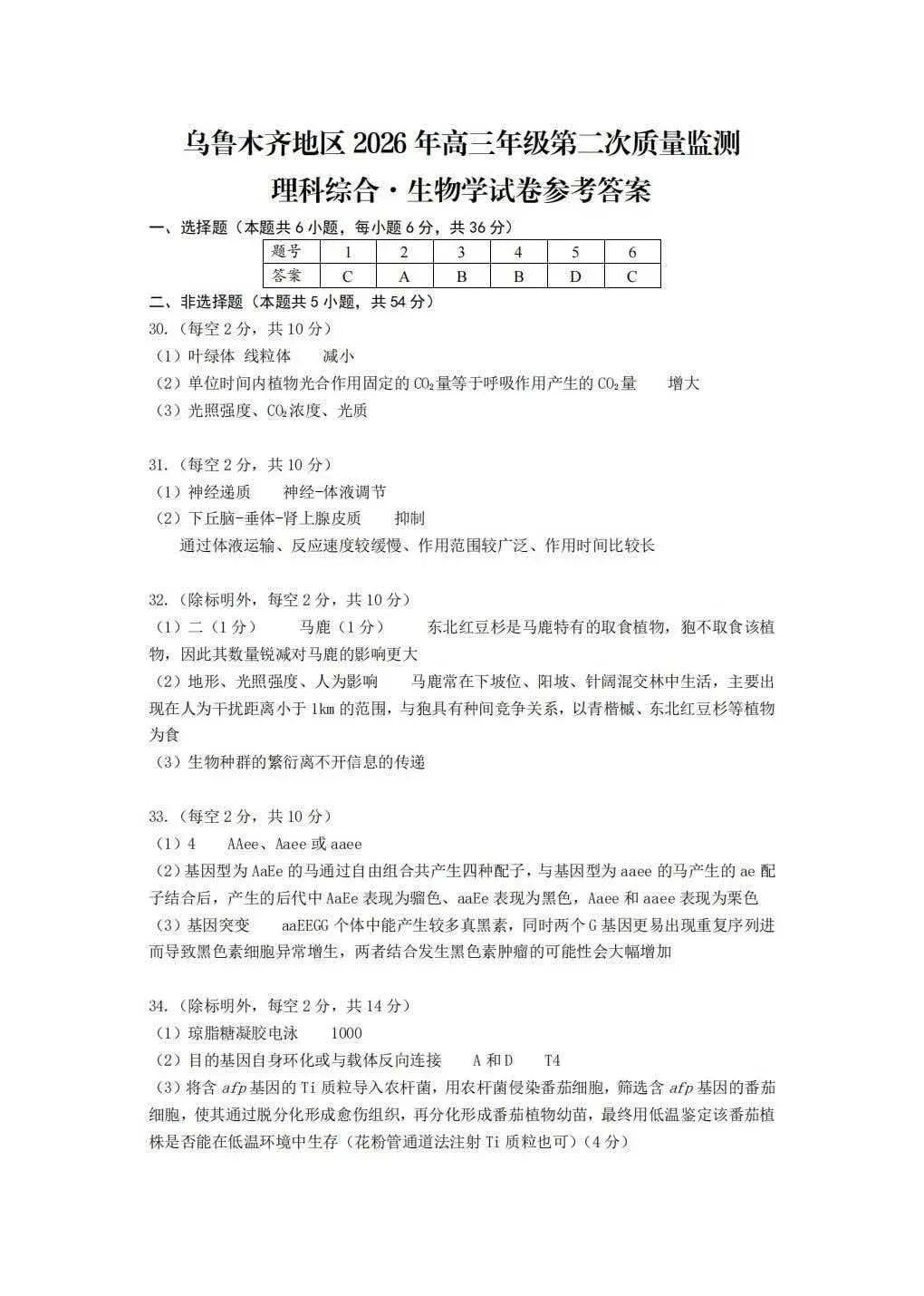 >全科试卷答案!乌鲁木齐2026年高三年级第二次质量监测参考答案