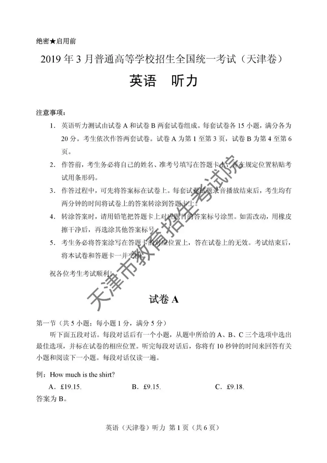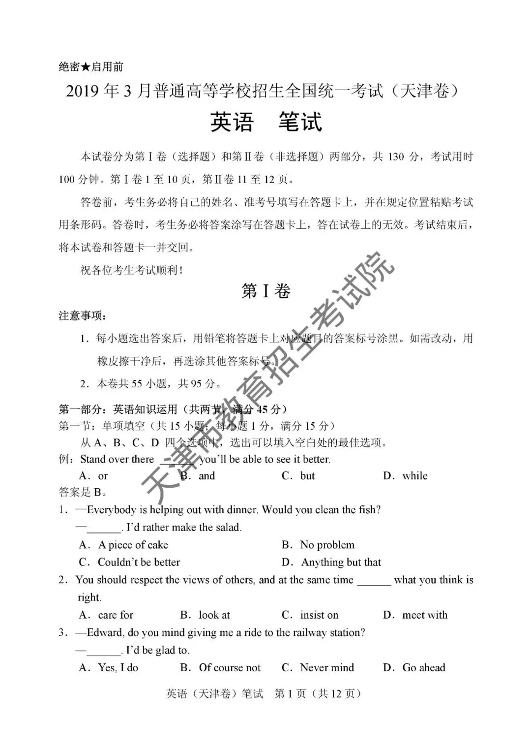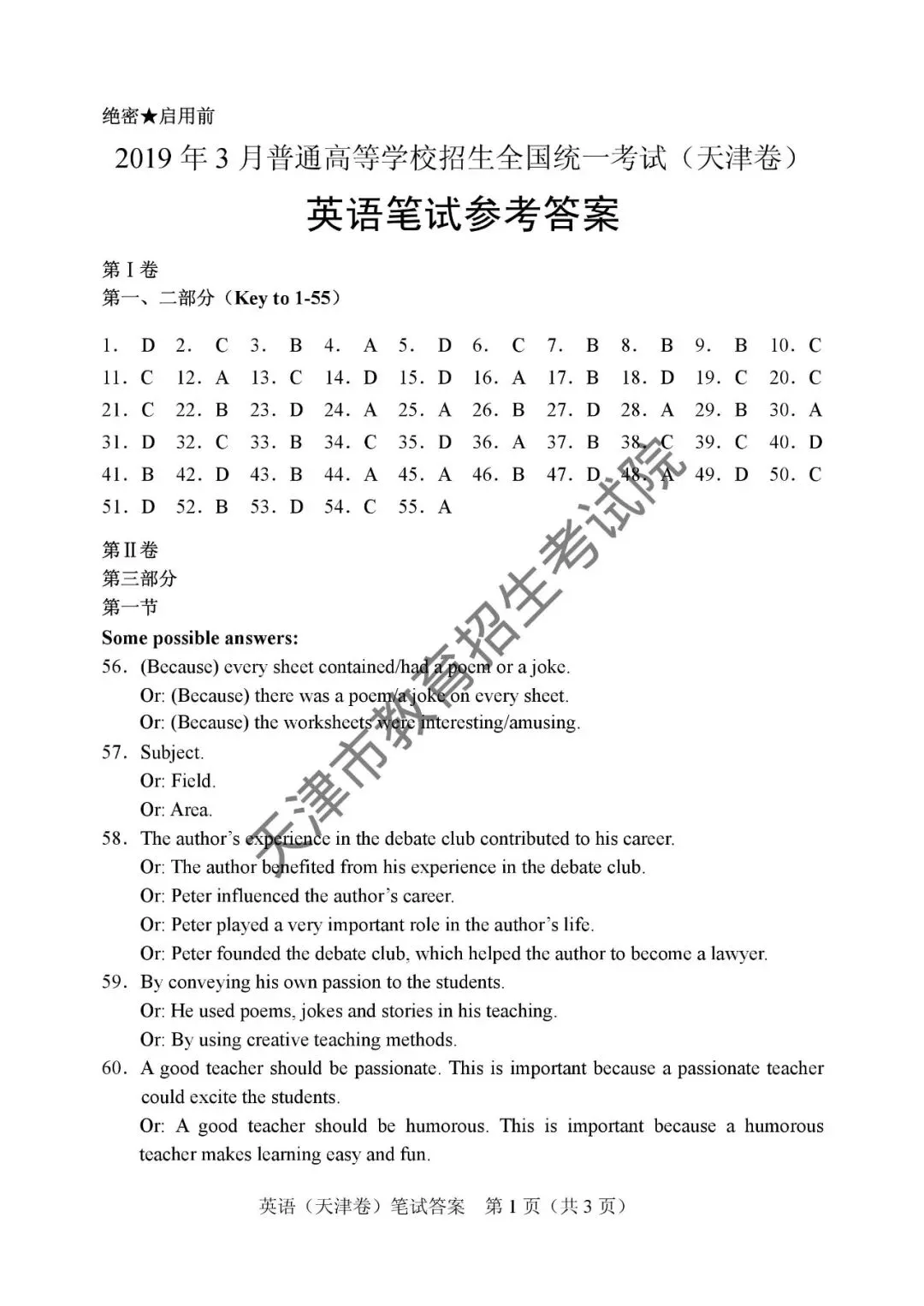 目前,评卷工作即将开始,预计考试成绩将在4月中旬发布。现将2019年3月高考英语科目第一次考试试卷及参考答案予以公布。