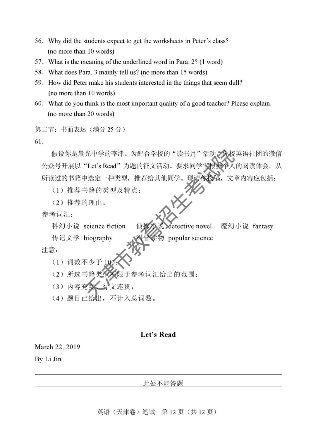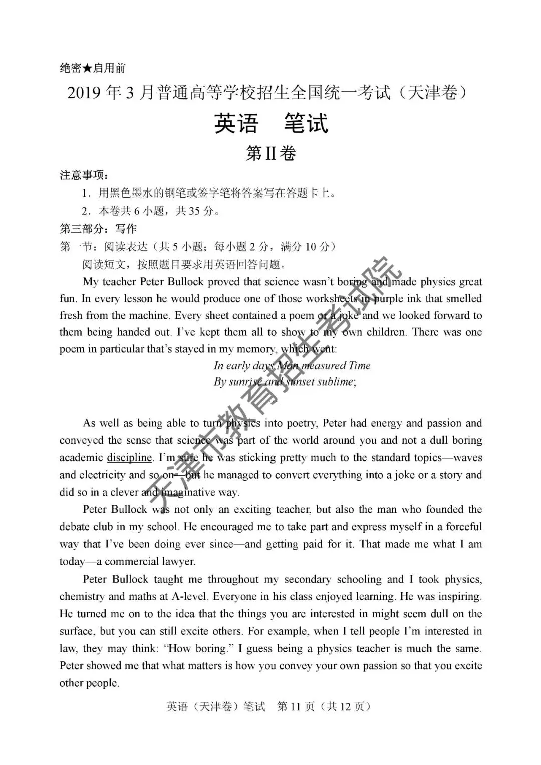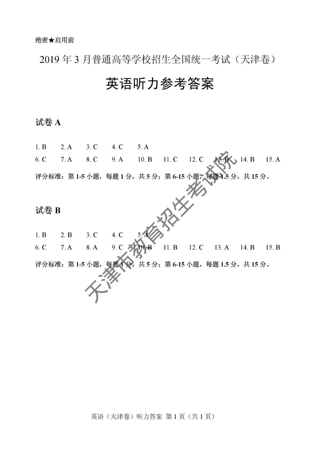 目前,评卷工作即将开始,预计考试成绩将在4月中旬发布。现将2019年3月高考英语科目第一次考试试卷及参考答案予以公布。