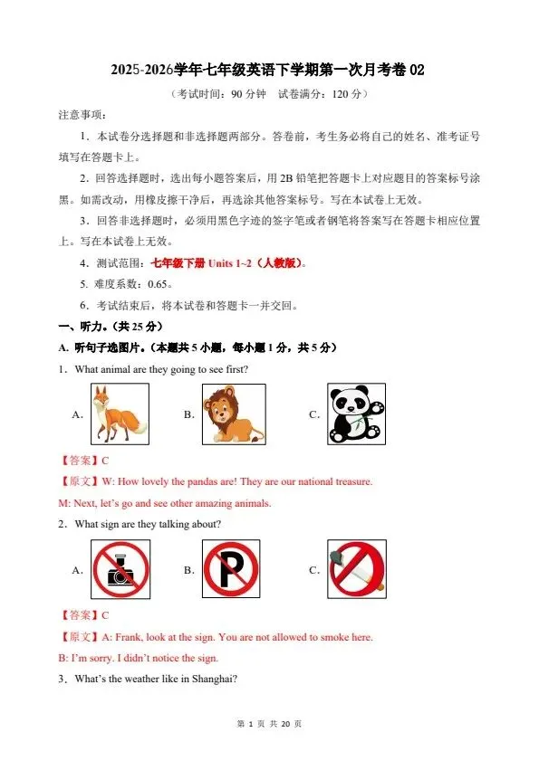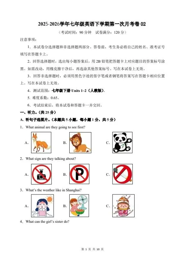 今日分享26春七年级下册人教英语第一次月考试卷(含答案)完整电子版可打印!所有资料均为高清电子版,排版规整适配打印,不用费心整理,直接打印就能用。精准击破学习难点,帮孩子夯实基础、吃透考点,稳步提升学习效率!