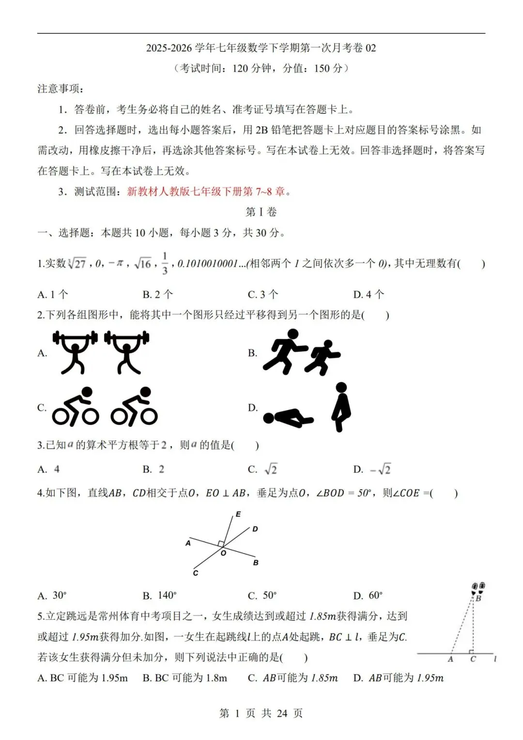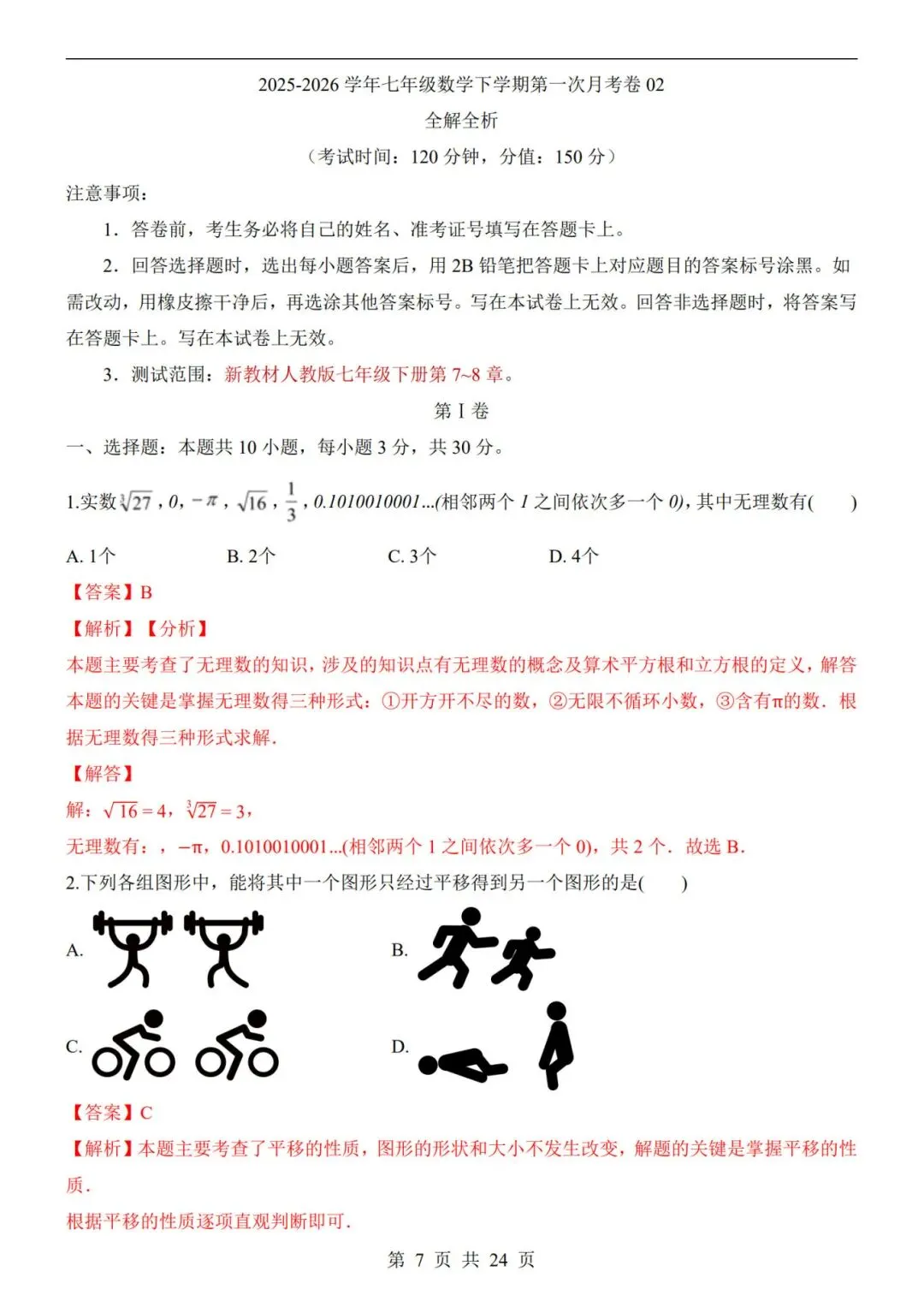 26春七年级下册【数学第一次月考试卷+答案解析24 页】|完整电子版可打印