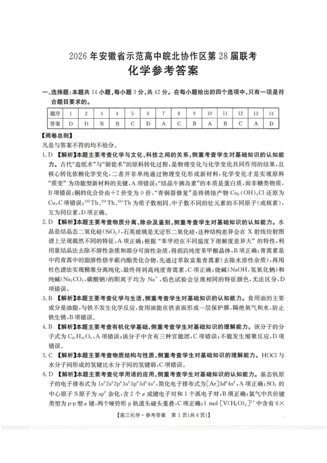 >化学试卷-2026年安徽省示范高中皖北协作区第28届高三3月联考