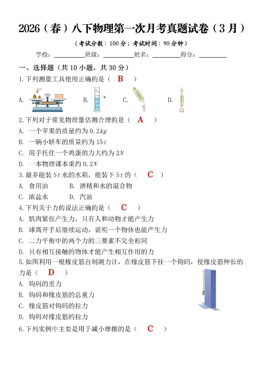>2026(春)八下物理第一次月考真题试卷(3月)(含答案),电子版可打印!